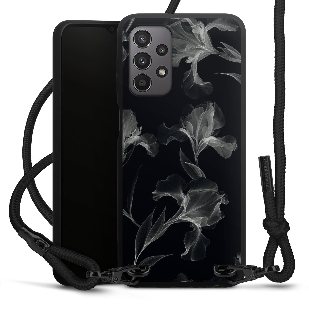 The matt black silicone case is made of flexible TPU (thermoplastic polyurethane) and offers robust protection. The durable, unbreakable material makes the cover flexible and dimensionally stable at the same time. The matte surface makes your design stand out more and is less susceptible to fingerprints and dirt. The stylish trend accessory fits comfortably in the hand and is perfectly complemented by the fabric (polyester) mobile phone strap. The braided fabric strap is approx. 1.70 metres long with a diameter of approx. 0.5 cm. Due to the special knotting technique, the length of the strap can be adjusted by simply pulling it, so that you can adapt it individually to your wishes. The practical case to wear around your neck is available with the fabric strap in black. As a little icing on the cake, we have provided the strap with a chic metal fastener in matt black. The strap is securely fastened to the case with loops made of high-quality genuine leather and press studs. The ends of the fabric strap are covered with metallic end caps and thus protected from fraying.