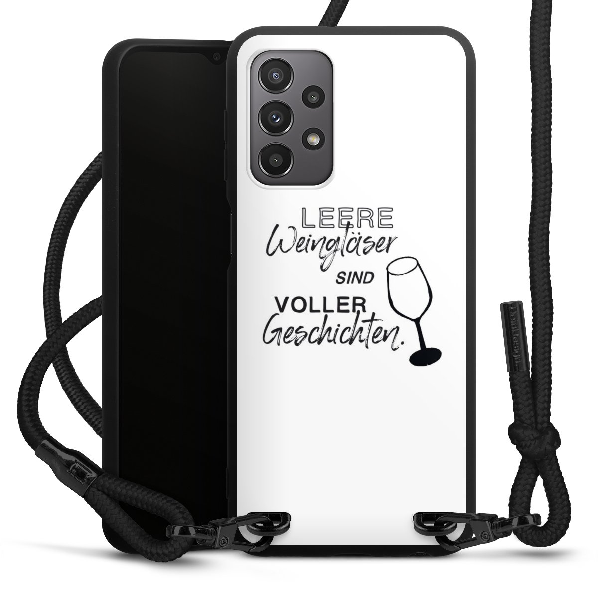 The matt black silicone case is made of flexible TPU (thermoplastic polyurethane) and offers robust protection. The durable, unbreakable material makes the cover flexible and dimensionally stable at the same time. The matte surface makes your design stand out more and is less susceptible to fingerprints and dirt. The stylish trend accessory fits comfortably in the hand and is perfectly complemented by the fabric (polyester) mobile phone strap. The braided fabric strap is approx. 1.70 metres long with a diameter of approx. 0.5 cm. Due to the special knotting technique, the length of the strap can be adjusted by simply pulling it, so that you can adapt it individually to your wishes. The practical case to wear around your neck is available with the fabric strap in black. As a little icing on the cake, we have provided the strap with a chic metal fastener in matt black. The strap is securely fastened to the case with loops made of high-quality genuine leather and press studs. The ends of the fabric strap are covered with metallic end caps and thus protected from fraying.