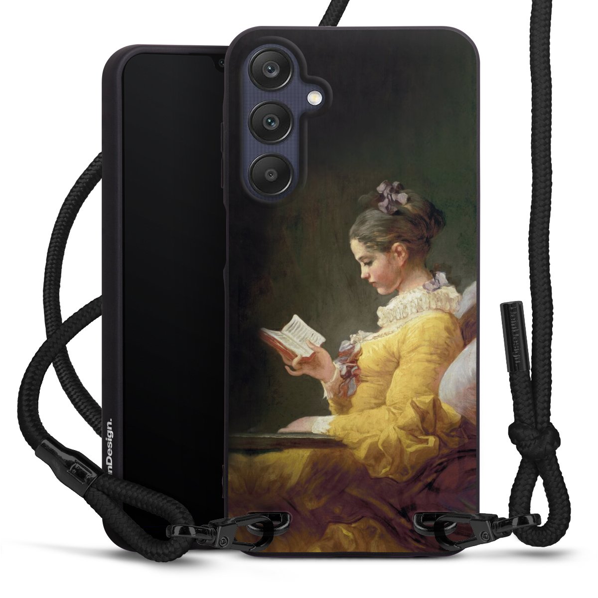 The matt black silicone case is made of flexible TPU (thermoplastic polyurethane) and offers robust protection. The durable, unbreakable material makes the cover flexible and dimensionally stable at the same time. The matte surface makes your design stand out more and is less susceptible to fingerprints and dirt. The stylish trend accessory fits comfortably in the hand and is perfectly complemented by the fabric (polyester) mobile phone strap. The braided fabric strap is approx. 1.70 metres long with a diameter of approx. 0.5 cm. Due to the special knotting technique, the length of the strap can be adjusted by simply pulling it, so that you can adapt it individually to your wishes. The practical case to wear around your neck is available with the fabric strap in black. As a little icing on the cake, we have provided the strap with a chic metal fastener in matt black. The strap is securely fastened to the case with loops made of high-quality genuine leather and press studs. The ends of the fabric strap are covered with metallic end caps and thus protected from fraying.