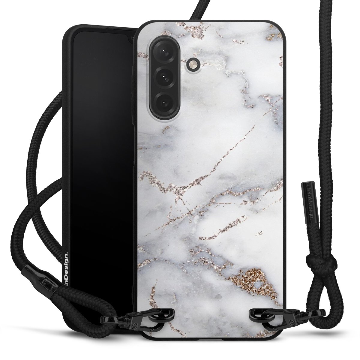 The matt black silicone case is made of flexible TPU (thermoplastic polyurethane) and offers robust protection. The durable, unbreakable material makes the cover flexible and dimensionally stable at the same time. The matte surface makes your design stand out more and is less susceptible to fingerprints and dirt. The stylish trend accessory fits comfortably in the hand and is perfectly complemented by the fabric (polyester) mobile phone strap. The braided fabric strap is approx. 1.70 metres long with a diameter of approx. 0.5 cm. Due to the special knotting technique, the length of the strap can be adjusted by simply pulling it, so that you can adapt it individually to your wishes. The practical case to wear around your neck is available with the fabric strap in black. As a little icing on the cake, we have provided the strap with a chic metal fastener in matt black. The strap is securely fastened to the case with loops made of high-quality genuine leather and press studs. The ends of the fabric strap are covered with metallic end caps and thus protected from fraying.