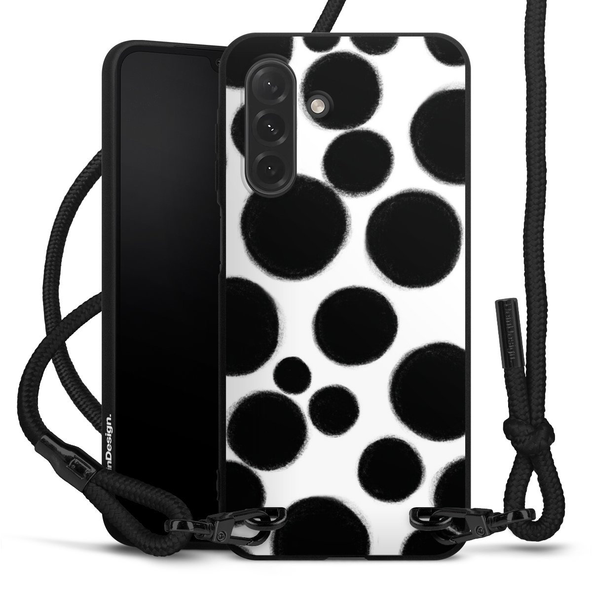 The matt black silicone case is made of flexible TPU (thermoplastic polyurethane) and offers robust protection. The durable, unbreakable material makes the cover flexible and dimensionally stable at the same time. The matte surface makes your design stand out more and is less susceptible to fingerprints and dirt. The stylish trend accessory fits comfortably in the hand and is perfectly complemented by the fabric (polyester) mobile phone strap. The braided fabric strap is approx. 1.70 metres long with a diameter of approx. 0.5 cm. Due to the special knotting technique, the length of the strap can be adjusted by simply pulling it, so that you can adapt it individually to your wishes. The practical case to wear around your neck is available with the fabric strap in black. As a little icing on the cake, we have provided the strap with a chic metal fastener in matt black. The strap is securely fastened to the case with loops made of high-quality genuine leather and press studs. The ends of the fabric strap are covered with metallic end caps and thus protected from fraying.