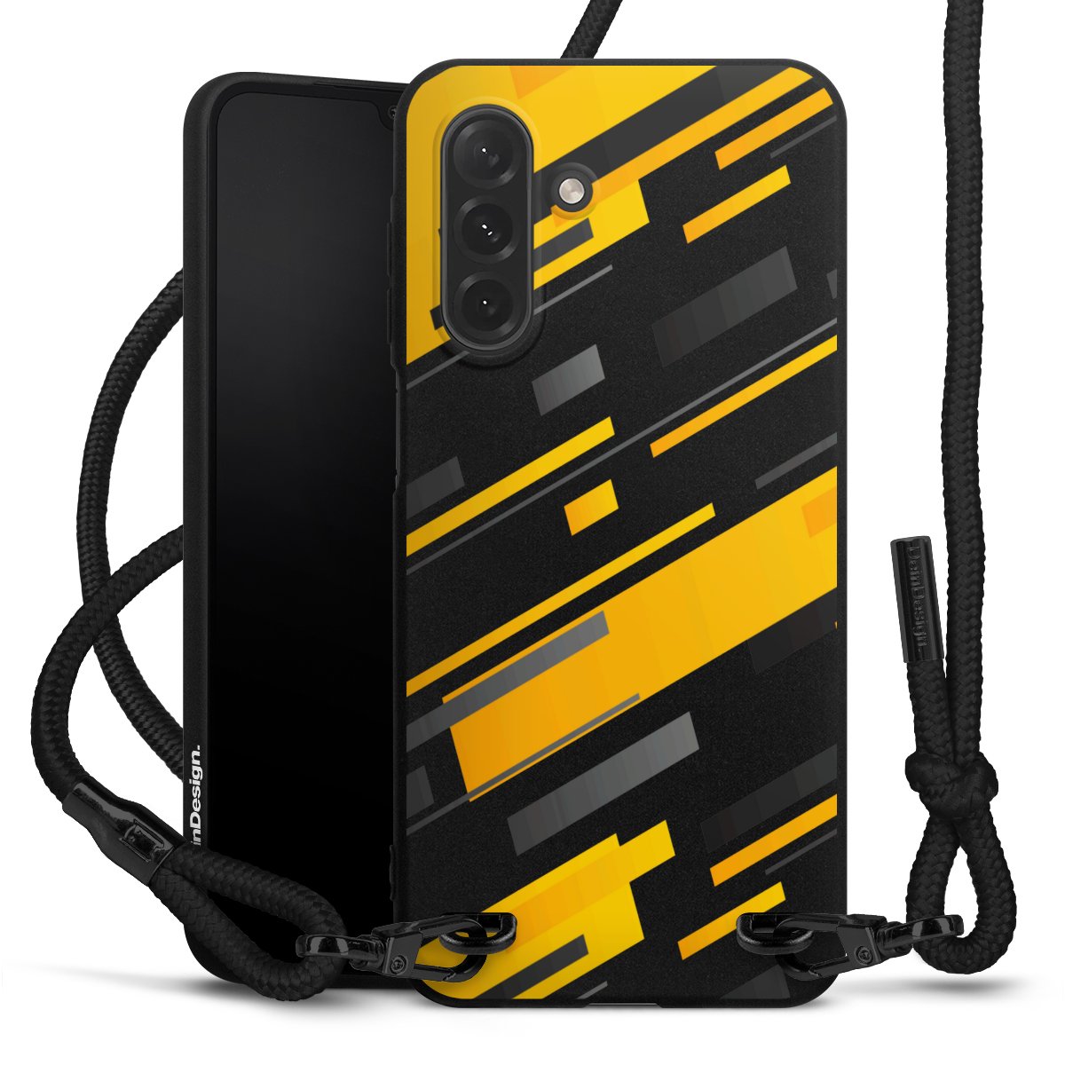 The matt black silicone case is made of flexible TPU (thermoplastic polyurethane) and offers robust protection. The durable, unbreakable material makes the cover flexible and dimensionally stable at the same time. The matte surface makes your design stand out more and is less susceptible to fingerprints and dirt. The stylish trend accessory fits comfortably in the hand and is perfectly complemented by the fabric (polyester) mobile phone strap. The braided fabric strap is approx. 1.70 metres long with a diameter of approx. 0.5 cm. Due to the special knotting technique, the length of the strap can be adjusted by simply pulling it, so that you can adapt it individually to your wishes. The practical case to wear around your neck is available with the fabric strap in black. As a little icing on the cake, we have provided the strap with a chic metal fastener in matt black. The strap is securely fastened to the case with loops made of high-quality genuine leather and press studs. The ends of the fabric strap are covered with metallic end caps and thus protected from fraying.