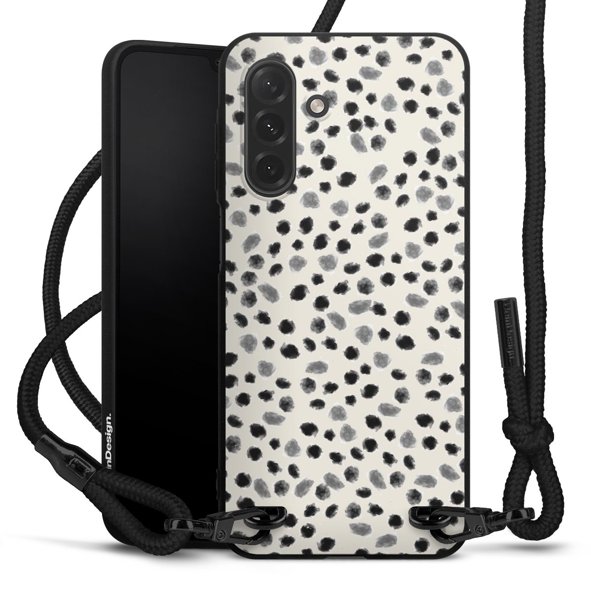 The matt black silicone case is made of flexible TPU (thermoplastic polyurethane) and offers robust protection. The durable, unbreakable material makes the cover flexible and dimensionally stable at the same time. The matte surface makes your design stand out more and is less susceptible to fingerprints and dirt. The stylish trend accessory fits comfortably in the hand and is perfectly complemented by the fabric (polyester) mobile phone strap. The braided fabric strap is approx. 1.70 metres long with a diameter of approx. 0.5 cm. Due to the special knotting technique, the length of the strap can be adjusted by simply pulling it, so that you can adapt it individually to your wishes. The practical case to wear around your neck is available with the fabric strap in black. As a little icing on the cake, we have provided the strap with a chic metal fastener in matt black. The strap is securely fastened to the case with loops made of high-quality genuine leather and press studs. The ends of the fabric strap are covered with metallic end caps and thus protected from fraying.