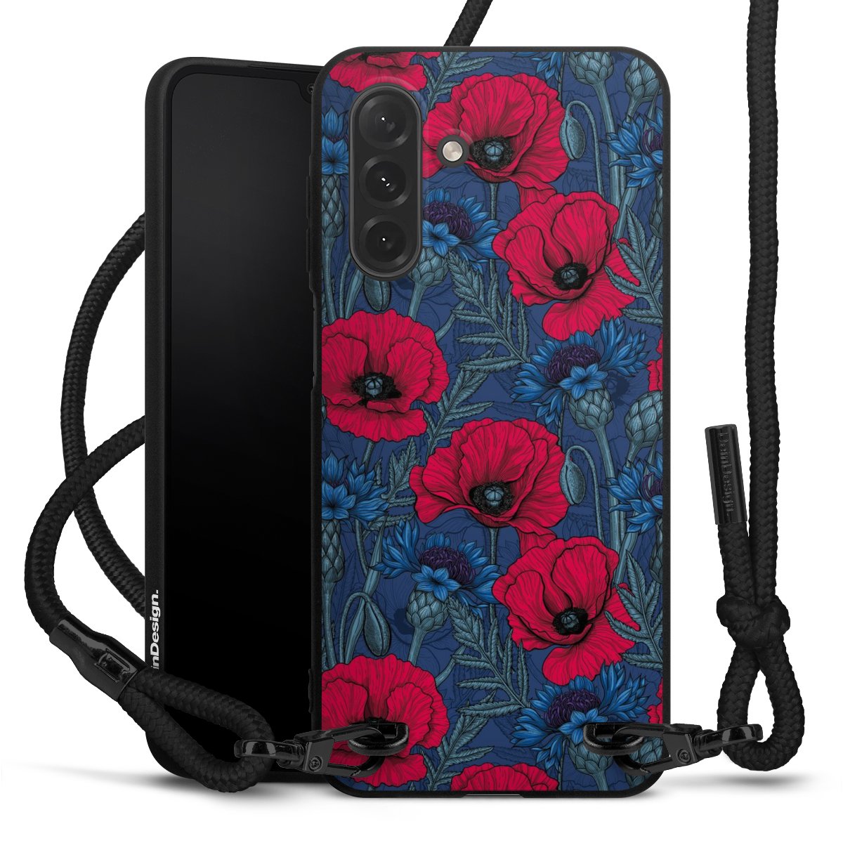 The matt black silicone case is made of flexible TPU (thermoplastic polyurethane) and offers robust protection. The durable, unbreakable material makes the cover flexible and dimensionally stable at the same time. The matte surface makes your design stand out more and is less susceptible to fingerprints and dirt. The stylish trend accessory fits comfortably in the hand and is perfectly complemented by the fabric (polyester) mobile phone strap. The braided fabric strap is approx. 1.70 metres long with a diameter of approx. 0.5 cm. Due to the special knotting technique, the length of the strap can be adjusted by simply pulling it, so that you can adapt it individually to your wishes. The practical case to wear around your neck is available with the fabric strap in black. As a little icing on the cake, we have provided the strap with a chic metal fastener in matt black. The strap is securely fastened to the case with loops made of high-quality genuine leather and press studs. The ends of the fabric strap are covered with metallic end caps and thus protected from fraying.