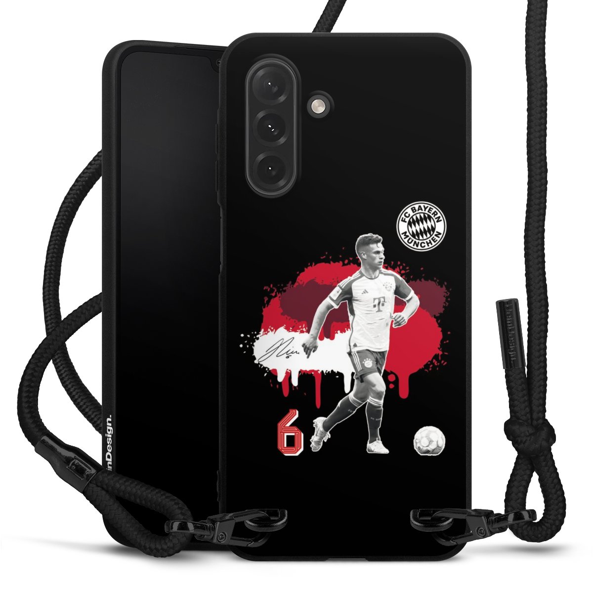 The matt black silicone case is made of flexible TPU (thermoplastic polyurethane) and offers robust protection. The durable, unbreakable material makes the cover flexible and dimensionally stable at the same time. The matte surface makes your design stand out more and is less susceptible to fingerprints and dirt. The stylish trend accessory fits comfortably in the hand and is perfectly complemented by the fabric (polyester) mobile phone strap. The braided fabric strap is approx. 1.70 metres long with a diameter of approx. 0.5 cm. Due to the special knotting technique, the length of the strap can be adjusted by simply pulling it, so that you can adapt it individually to your wishes. The practical case to wear around your neck is available with the fabric strap in black. As a little icing on the cake, we have provided the strap with a chic metal fastener in matt black. The strap is securely fastened to the case with loops made of high-quality genuine leather and press studs. The ends of the fabric strap are covered with metallic end caps and thus protected from fraying.