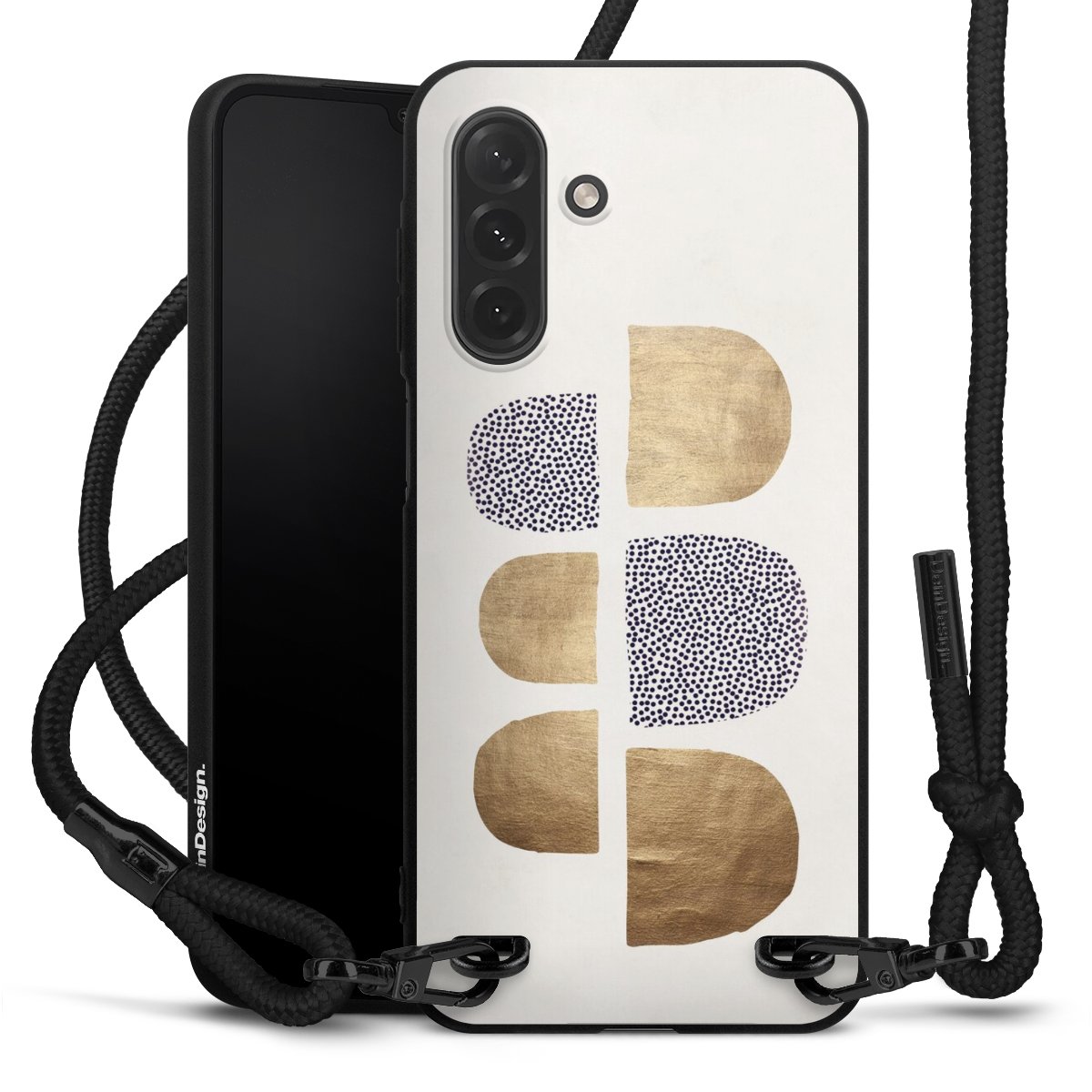 The matt black silicone case is made of flexible TPU (thermoplastic polyurethane) and offers robust protection. The durable, unbreakable material makes the cover flexible and dimensionally stable at the same time. The matte surface makes your design stand out more and is less susceptible to fingerprints and dirt. The stylish trend accessory fits comfortably in the hand and is perfectly complemented by the fabric (polyester) mobile phone strap. The braided fabric strap is approx. 1.70 metres long with a diameter of approx. 0.5 cm. Due to the special knotting technique, the length of the strap can be adjusted by simply pulling it, so that you can adapt it individually to your wishes. The practical case to wear around your neck is available with the fabric strap in black. As a little icing on the cake, we have provided the strap with a chic metal fastener in matt black. The strap is securely fastened to the case with loops made of high-quality genuine leather and press studs. The ends of the fabric strap are covered with metallic end caps and thus protected from fraying.