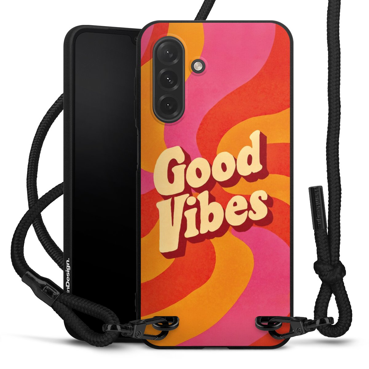 The matt black silicone case is made of flexible TPU (thermoplastic polyurethane) and offers robust protection. The durable, unbreakable material makes the cover flexible and dimensionally stable at the same time. The matte surface makes your design stand out more and is less susceptible to fingerprints and dirt. The stylish trend accessory fits comfortably in the hand and is perfectly complemented by the fabric (polyester) mobile phone strap. The braided fabric strap is approx. 1.70 metres long with a diameter of approx. 0.5 cm. Due to the special knotting technique, the length of the strap can be adjusted by simply pulling it, so that you can adapt it individually to your wishes. The practical case to wear around your neck is available with the fabric strap in black. As a little icing on the cake, we have provided the strap with a chic metal fastener in matt black. The strap is securely fastened to the case with loops made of high-quality genuine leather and press studs. The ends of the fabric strap are covered with metallic end caps and thus protected from fraying.