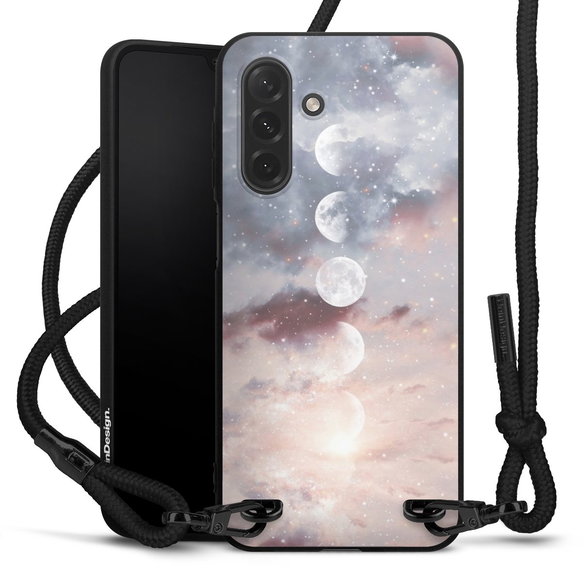 Pure Black: Phone case, fabric strap and metal details in stylish matt black.