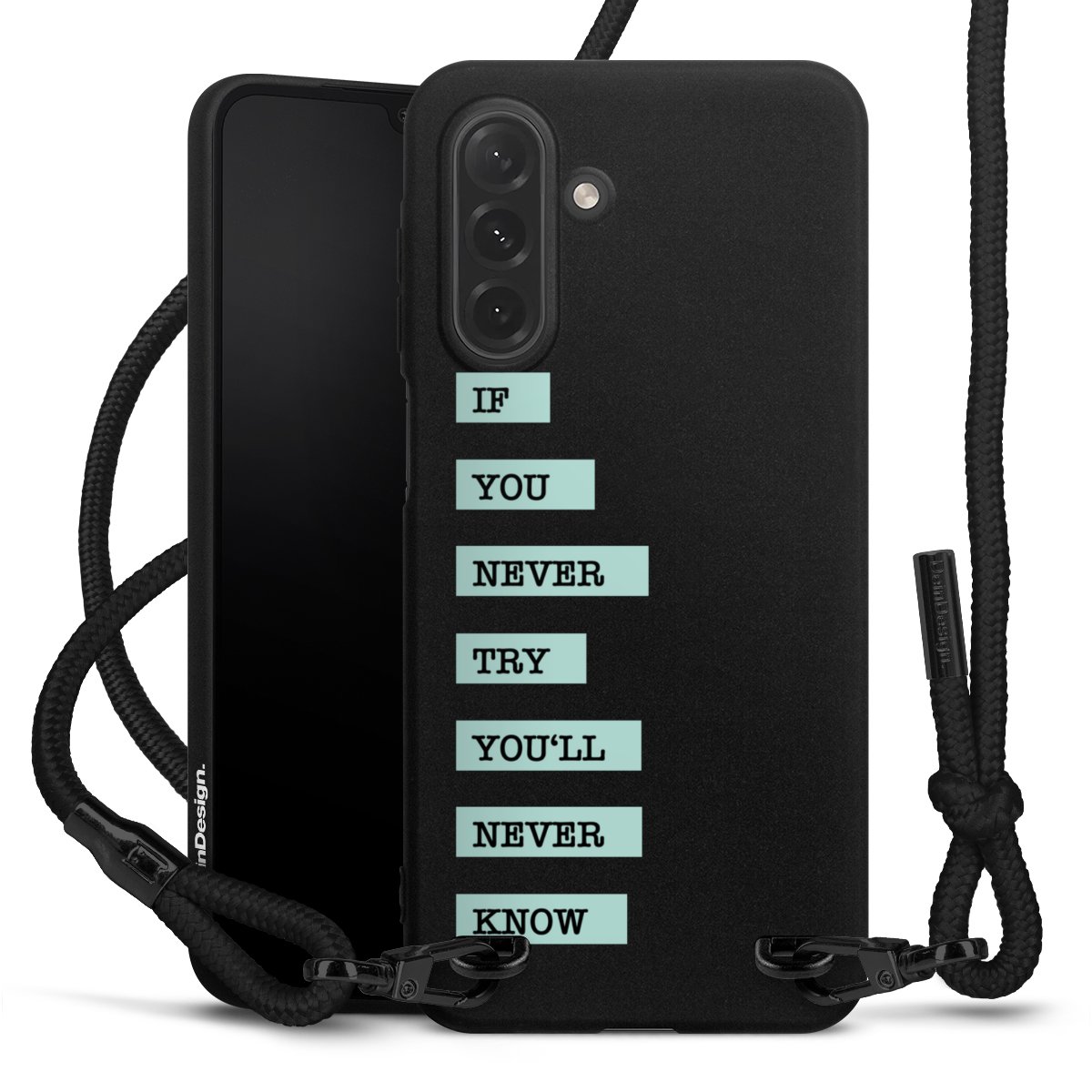 The matt black silicone case is made of flexible TPU (thermoplastic polyurethane) and offers robust protection. The durable, unbreakable material makes the cover flexible and dimensionally stable at the same time. The matte surface makes your design stand out more and is less susceptible to fingerprints and dirt. The stylish trend accessory fits comfortably in the hand and is perfectly complemented by the fabric (polyester) mobile phone strap. The braided fabric strap is approx. 1.70 metres long with a diameter of approx. 0.5 cm. Due to the special knotting technique, the length of the strap can be adjusted by simply pulling it, so that you can adapt it individually to your wishes. The practical case to wear around your neck is available with the fabric strap in black. As a little icing on the cake, we have provided the strap with a chic metal fastener in matt black. The strap is securely fastened to the case with loops made of high-quality genuine leather and press studs. The ends of the fabric strap are covered with metallic end caps and thus protected from fraying.
