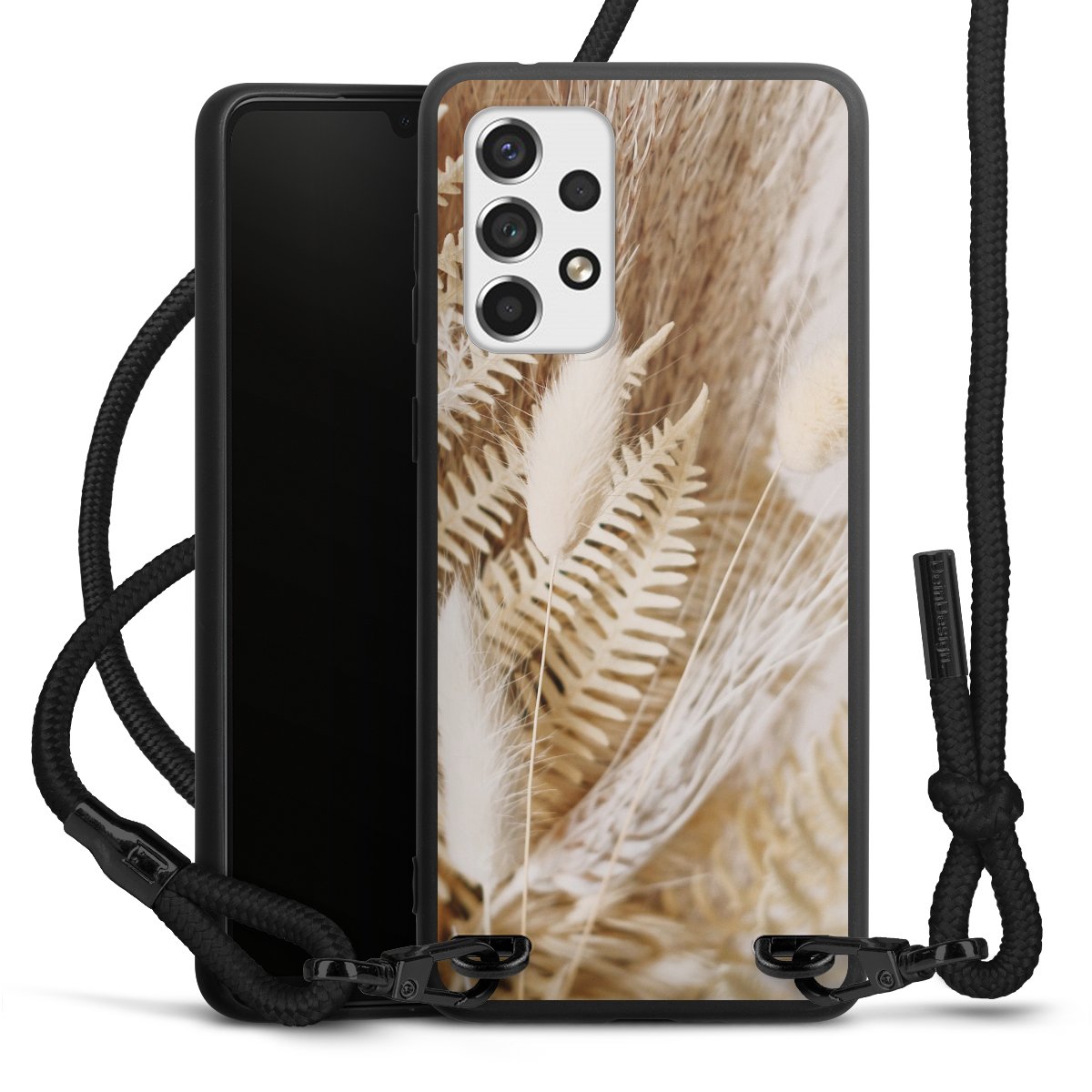 The matt black silicone case is made of flexible TPU (thermoplastic polyurethane) and offers robust protection. The durable, unbreakable material makes the cover flexible and dimensionally stable at the same time. The matte surface makes your design stand out more and is less susceptible to fingerprints and dirt. The stylish trend accessory fits comfortably in the hand and is perfectly complemented by the fabric (polyester) mobile phone strap. The braided fabric strap is approx. 1.70 metres long with a diameter of approx. 0.5 cm. Due to the special knotting technique, the length of the strap can be adjusted by simply pulling it, so that you can adapt it individually to your wishes. The practical case to wear around your neck is available with the fabric strap in black. As a little icing on the cake, we have provided the strap with a chic metal fastener in matt black. The strap is securely fastened to the case with loops made of high-quality genuine leather and press studs. The ends of the fabric strap are covered with metallic end caps and thus protected from fraying.
