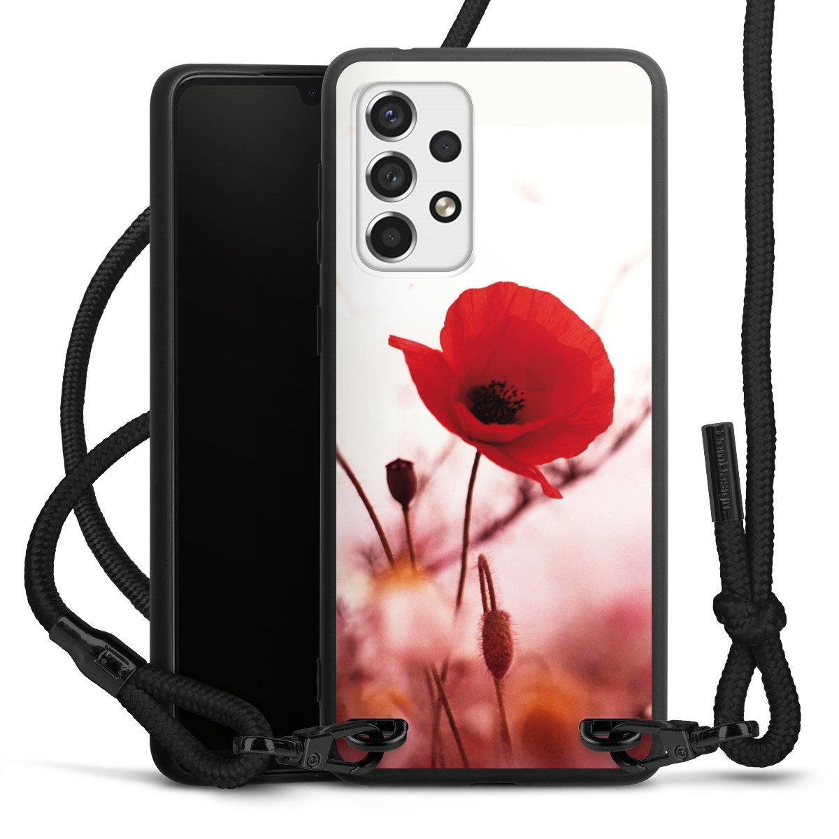 The matt black silicone case is made of flexible TPU (thermoplastic polyurethane) and offers robust protection. The durable, unbreakable material makes the cover flexible and dimensionally stable at the same time. The matte surface makes your design stand out more and is less susceptible to fingerprints and dirt. The stylish trend accessory fits comfortably in the hand and is perfectly complemented by the fabric (polyester) mobile phone strap. The braided fabric strap is approx. 1.70 metres long with a diameter of approx. 0.5 cm. Due to the special knotting technique, the length of the strap can be adjusted by simply pulling it, so that you can adapt it individually to your wishes. The practical case to wear around your neck is available with the fabric strap in black. As a little icing on the cake, we have provided the strap with a chic metal fastener in matt black. The strap is securely fastened to the case with loops made of high-quality genuine leather and press studs. The ends of the fabric strap are covered with metallic end caps and thus protected from fraying.