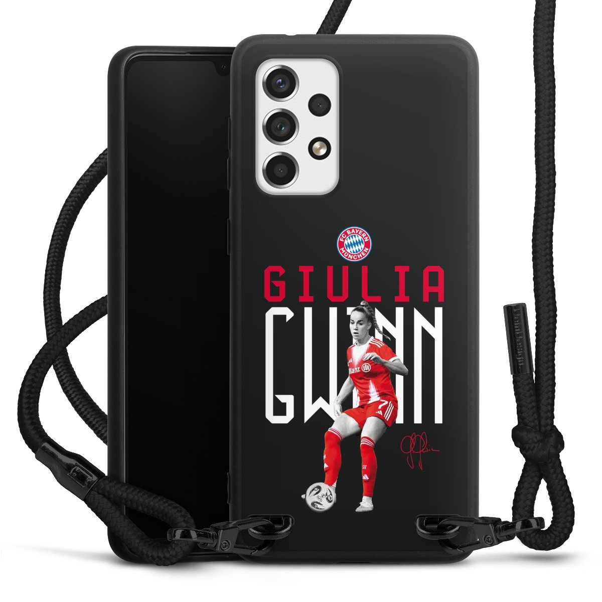 The matt black silicone case is made of flexible TPU (thermoplastic polyurethane) and offers robust protection. The durable, unbreakable material makes the cover flexible and dimensionally stable at the same time. The matte surface makes your design stand out more and is less susceptible to fingerprints and dirt. The stylish trend accessory fits comfortably in the hand and is perfectly complemented by the fabric (polyester) mobile phone strap. The braided fabric strap is approx. 1.70 metres long with a diameter of approx. 0.5 cm. Due to the special knotting technique, the length of the strap can be adjusted by simply pulling it, so that you can adapt it individually to your wishes. The practical case to wear around your neck is available with the fabric strap in black. As a little icing on the cake, we have provided the strap with a chic metal fastener in matt black. The strap is securely fastened to the case with loops made of high-quality genuine leather and press studs. The ends of the fabric strap are covered with metallic end caps and thus protected from fraying.