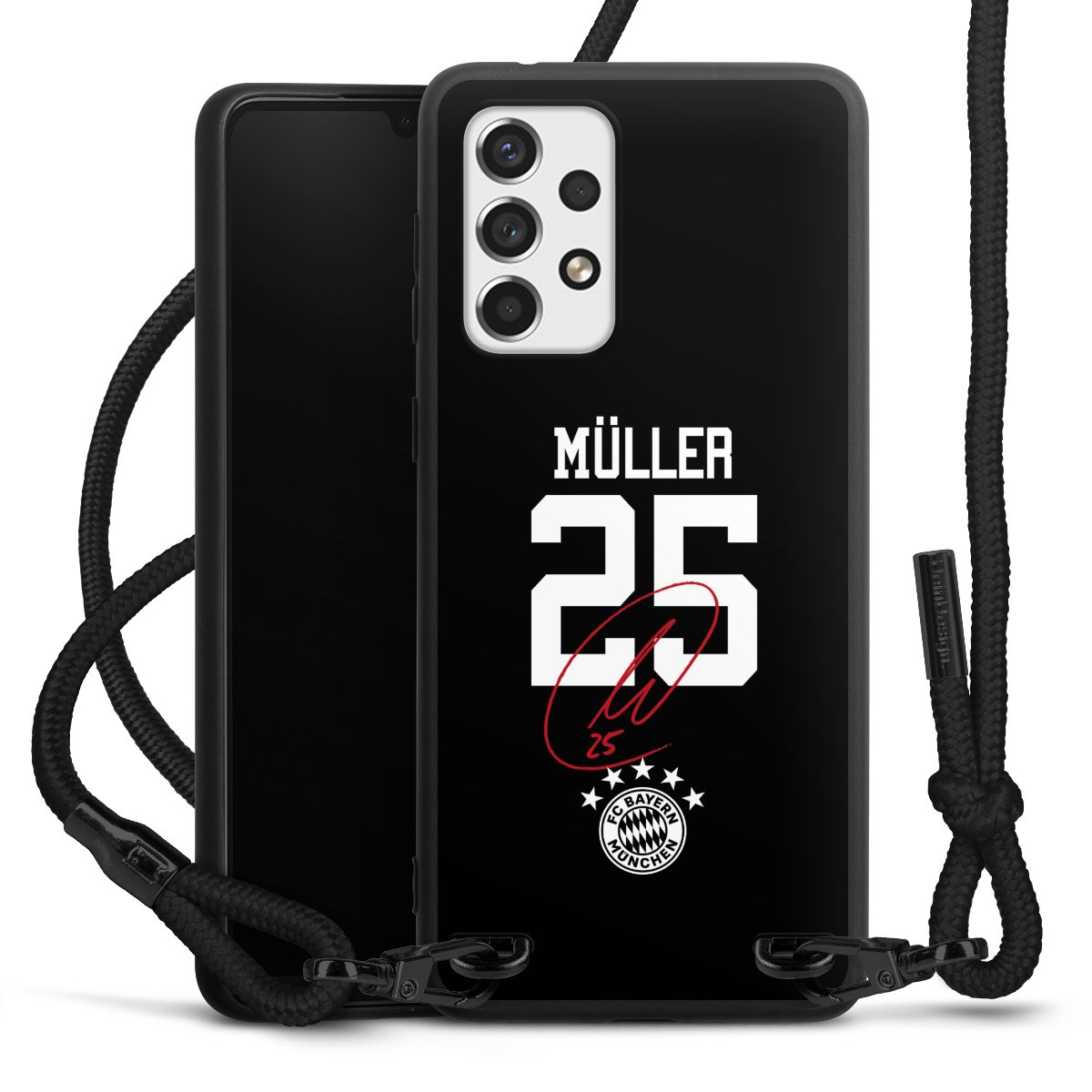 The matt black silicone case is made of flexible TPU (thermoplastic polyurethane) and offers robust protection. The durable, unbreakable material makes the cover flexible and dimensionally stable at the same time. The matte surface makes your design stand out more and is less susceptible to fingerprints and dirt. The stylish trend accessory fits comfortably in the hand and is perfectly complemented by the fabric (polyester) mobile phone strap. The braided fabric strap is approx. 1.70 metres long with a diameter of approx. 0.5 cm. Due to the special knotting technique, the length of the strap can be adjusted by simply pulling it, so that you can adapt it individually to your wishes. The practical case to wear around your neck is available with the fabric strap in black. As a little icing on the cake, we have provided the strap with a chic metal fastener in matt black. The strap is securely fastened to the case with loops made of high-quality genuine leather and press studs. The ends of the fabric strap are covered with metallic end caps and thus protected from fraying.