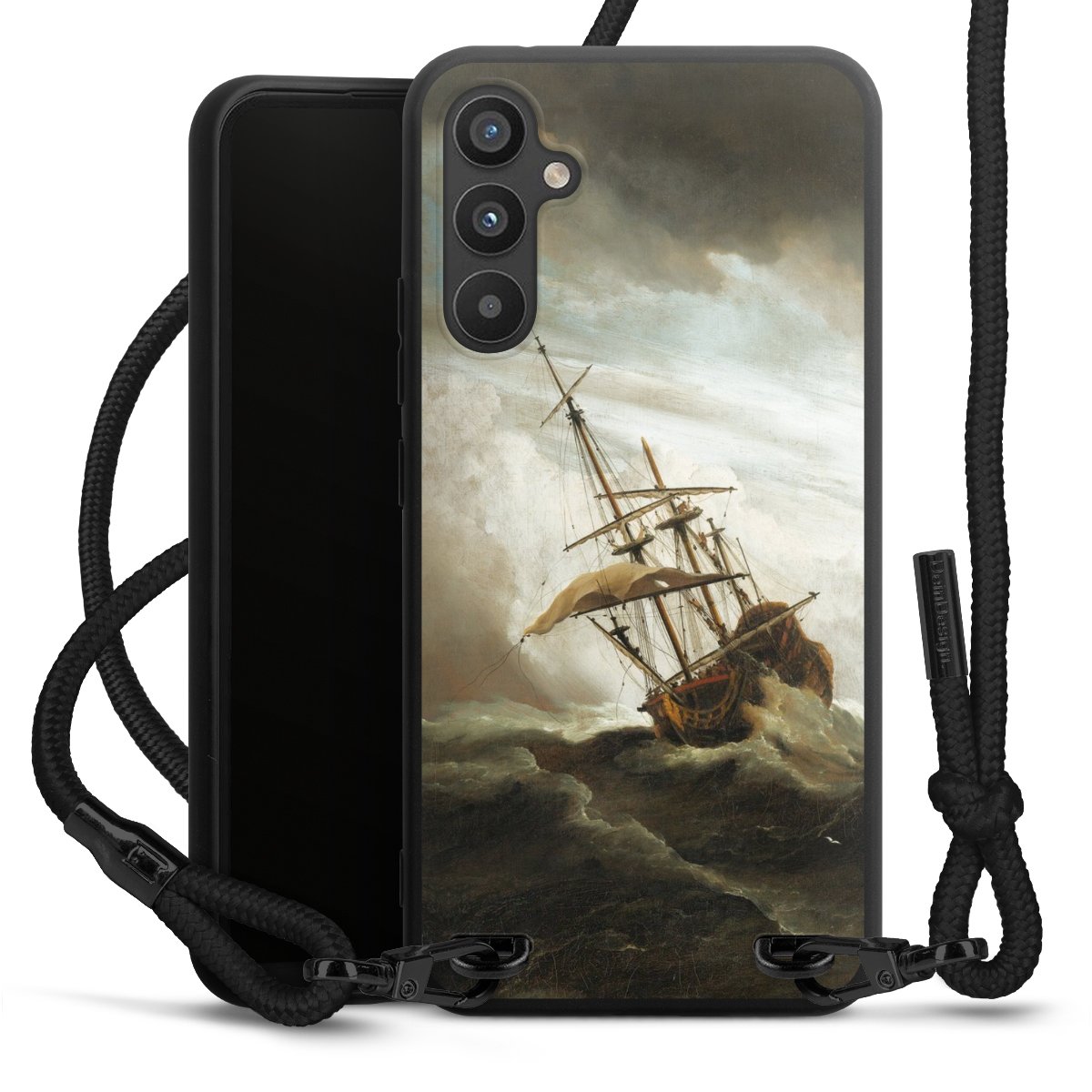 The matt black silicone case is made of flexible TPU (thermoplastic polyurethane) and offers robust protection. The durable, unbreakable material makes the cover flexible and dimensionally stable at the same time. The matte surface makes your design stand out more and is less susceptible to fingerprints and dirt. The stylish trend accessory fits comfortably in the hand and is perfectly complemented by the fabric (polyester) mobile phone strap. The braided fabric strap is approx. 1.70 metres long with a diameter of approx. 0.5 cm. Due to the special knotting technique, the length of the strap can be adjusted by simply pulling it, so that you can adapt it individually to your wishes. The practical case to wear around your neck is available with the fabric strap in black. As a little icing on the cake, we have provided the strap with a chic metal fastener in matt black. The strap is securely fastened to the case with loops made of high-quality genuine leather and press studs. The ends of the fabric strap are covered with metallic end caps and thus protected from fraying.