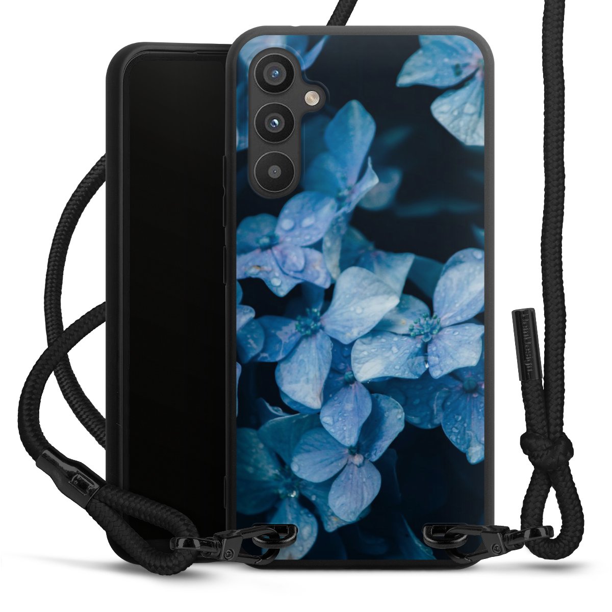 The matt black silicone case is made of flexible TPU (thermoplastic polyurethane) and offers robust protection. The durable, unbreakable material makes the cover flexible and dimensionally stable at the same time. The matte surface makes your design stand out more and is less susceptible to fingerprints and dirt. The stylish trend accessory fits comfortably in the hand and is perfectly complemented by the fabric (polyester) mobile phone strap. The braided fabric strap is approx. 1.70 metres long with a diameter of approx. 0.5 cm. Due to the special knotting technique, the length of the strap can be adjusted by simply pulling it, so that you can adapt it individually to your wishes. The practical case to wear around your neck is available with the fabric strap in black. As a little icing on the cake, we have provided the strap with a chic metal fastener in matt black. The strap is securely fastened to the case with loops made of high-quality genuine leather and press studs. The ends of the fabric strap are covered with metallic end caps and thus protected from fraying.