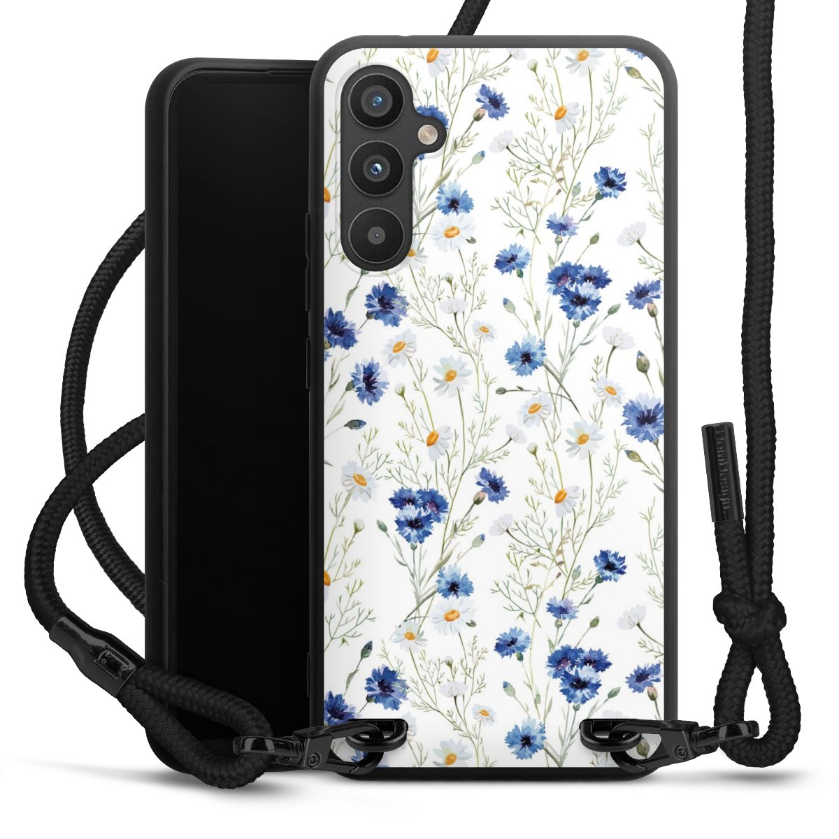 The matt black silicone case is made of flexible TPU (thermoplastic polyurethane) and offers robust protection. The durable, unbreakable material makes the cover flexible and dimensionally stable at the same time. The matte surface makes your design stand out more and is less susceptible to fingerprints and dirt. The stylish trend accessory fits comfortably in the hand and is perfectly complemented by the fabric (polyester) mobile phone strap. The braided fabric strap is approx. 1.70 metres long with a diameter of approx. 0.5 cm. Due to the special knotting technique, the length of the strap can be adjusted by simply pulling it, so that you can adapt it individually to your wishes. The practical case to wear around your neck is available with the fabric strap in black. As a little icing on the cake, we have provided the strap with a chic metal fastener in matt black. The strap is securely fastened to the case with loops made of high-quality genuine leather and press studs. The ends of the fabric strap are covered with metallic end caps and thus protected from fraying.