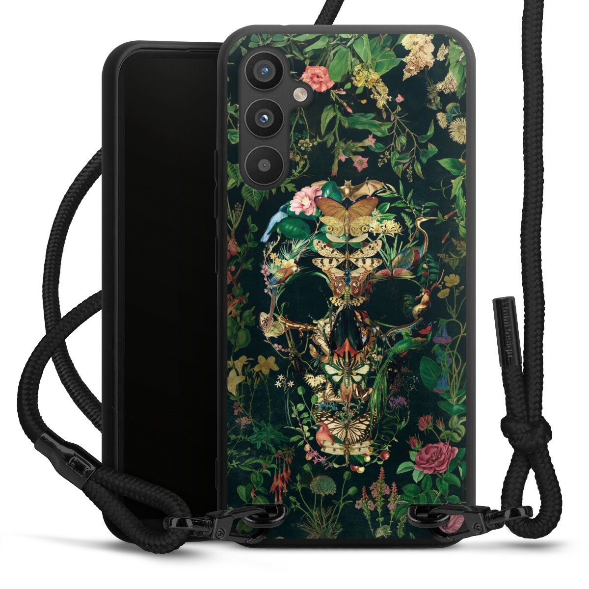 The matt black silicone case is made of flexible TPU (thermoplastic polyurethane) and offers robust protection. The durable, unbreakable material makes the cover flexible and dimensionally stable at the same time. The matte surface makes your design stand out more and is less susceptible to fingerprints and dirt. The stylish trend accessory fits comfortably in the hand and is perfectly complemented by the fabric (polyester) mobile phone strap. The braided fabric strap is approx. 1.70 metres long with a diameter of approx. 0.5 cm. Due to the special knotting technique, the length of the strap can be adjusted by simply pulling it, so that you can adapt it individually to your wishes. The practical case to wear around your neck is available with the fabric strap in black. As a little icing on the cake, we have provided the strap with a chic metal fastener in matt black. The strap is securely fastened to the case with loops made of high-quality genuine leather and press studs. The ends of the fabric strap are covered with metallic end caps and thus protected from fraying.