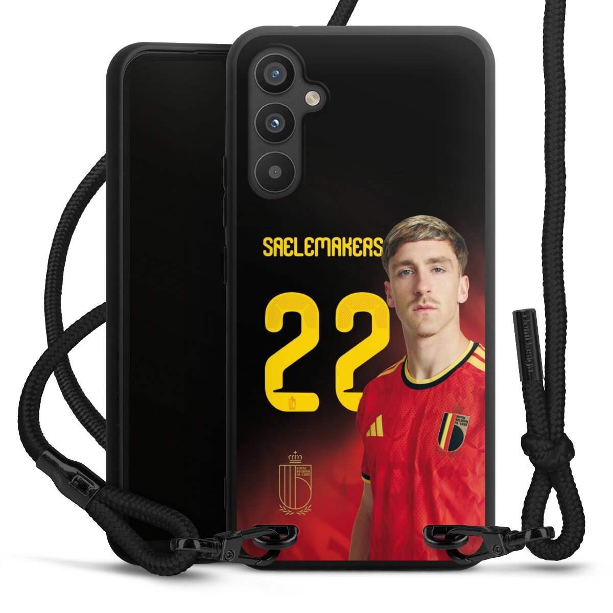 The matt black silicone case is made of flexible TPU (thermoplastic polyurethane) and offers robust protection. The durable, unbreakable material makes the cover flexible and dimensionally stable at the same time. The matte surface makes your design stand out more and is less susceptible to fingerprints and dirt. The stylish trend accessory fits comfortably in the hand and is perfectly complemented by the fabric (polyester) mobile phone strap. The braided fabric strap is approx. 1.70 metres long with a diameter of approx. 0.5 cm. Due to the special knotting technique, the length of the strap can be adjusted by simply pulling it, so that you can adapt it individually to your wishes. The practical case to wear around your neck is available with the fabric strap in black. As a little icing on the cake, we have provided the strap with a chic metal fastener in matt black. The strap is securely fastened to the case with loops made of high-quality genuine leather and press studs. The ends of the fabric strap are covered with metallic end caps and thus protected from fraying.