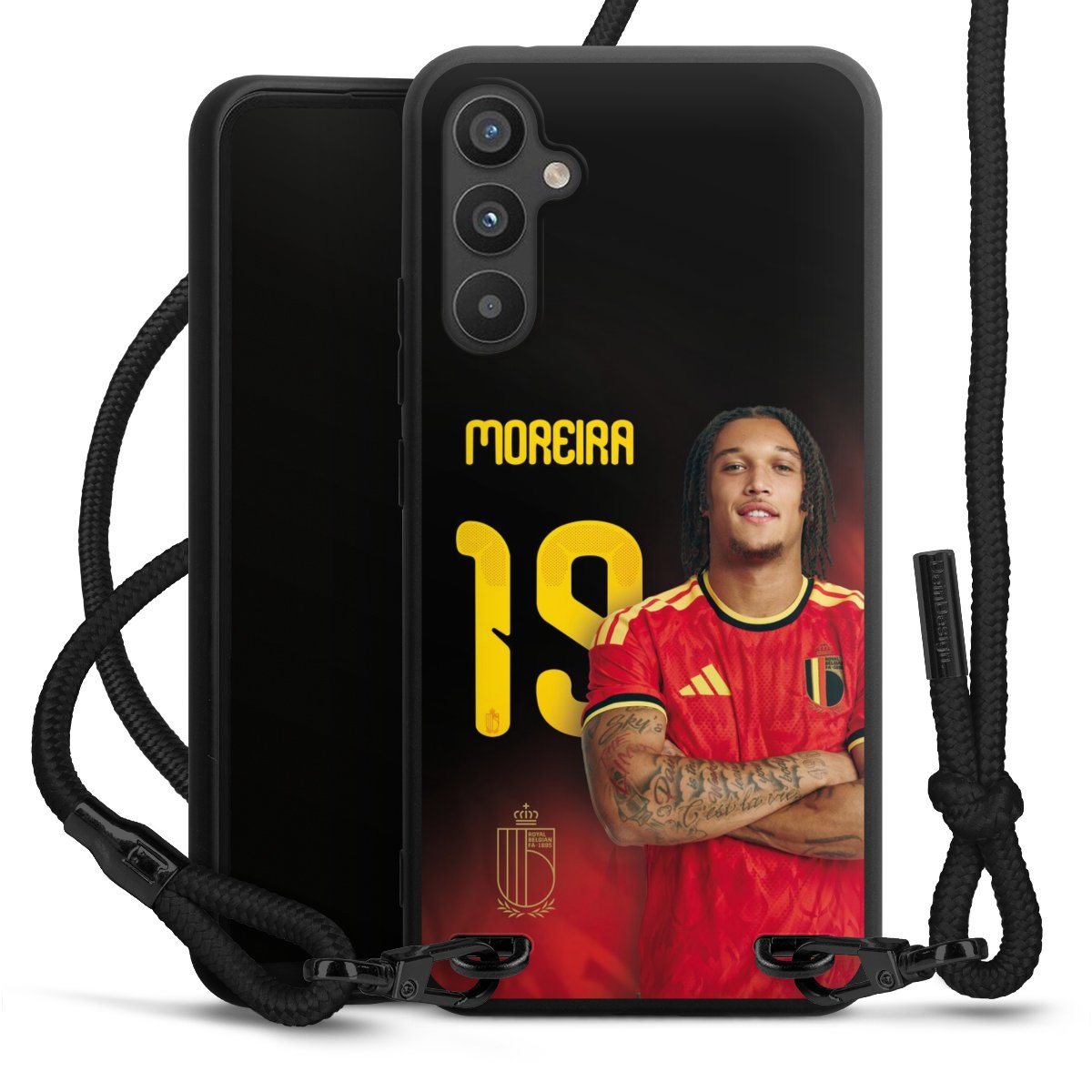 The matt black silicone case is made of flexible TPU (thermoplastic polyurethane) and offers robust protection. The durable, unbreakable material makes the cover flexible and dimensionally stable at the same time. The matte surface makes your design stand out more and is less susceptible to fingerprints and dirt. The stylish trend accessory fits comfortably in the hand and is perfectly complemented by the fabric (polyester) mobile phone strap. The braided fabric strap is approx. 1.70 metres long with a diameter of approx. 0.5 cm. Due to the special knotting technique, the length of the strap can be adjusted by simply pulling it, so that you can adapt it individually to your wishes. The practical case to wear around your neck is available with the fabric strap in black. As a little icing on the cake, we have provided the strap with a chic metal fastener in matt black. The strap is securely fastened to the case with loops made of high-quality genuine leather and press studs. The ends of the fabric strap are covered with metallic end caps and thus protected from fraying.