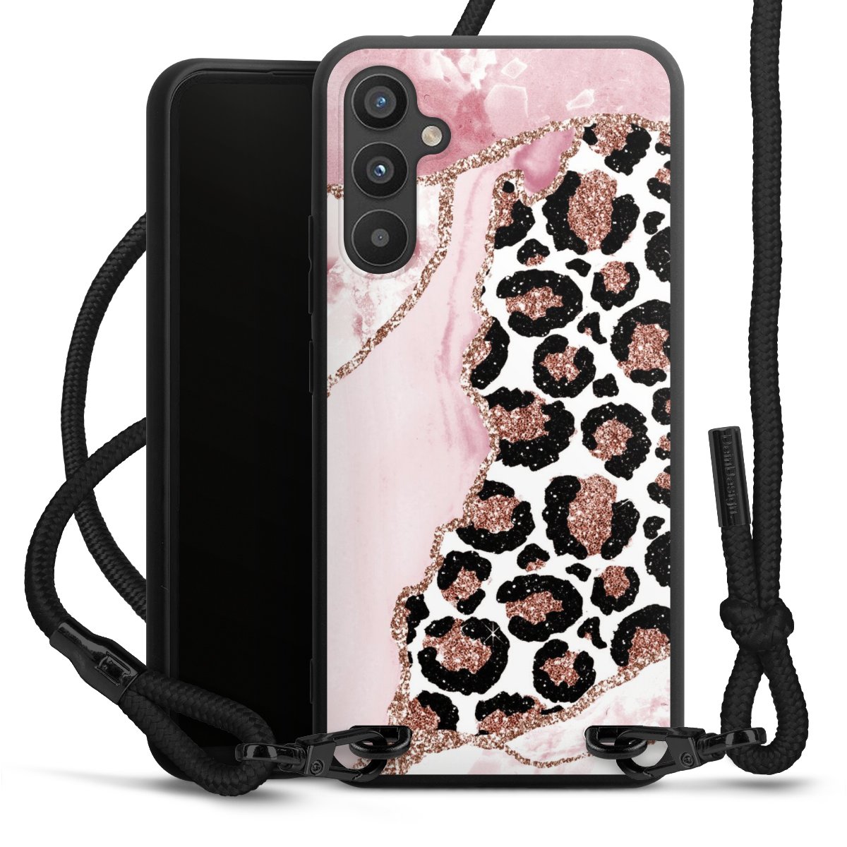 The matt black silicone case is made of flexible TPU (thermoplastic polyurethane) and offers robust protection. The durable, unbreakable material makes the cover flexible and dimensionally stable at the same time. The matte surface makes your design stand out more and is less susceptible to fingerprints and dirt. The stylish trend accessory fits comfortably in the hand and is perfectly complemented by the fabric (polyester) mobile phone strap. The braided fabric strap is approx. 1.70 metres long with a diameter of approx. 0.5 cm. Due to the special knotting technique, the length of the strap can be adjusted by simply pulling it, so that you can adapt it individually to your wishes. The practical case to wear around your neck is available with the fabric strap in black. As a little icing on the cake, we have provided the strap with a chic metal fastener in matt black. The strap is securely fastened to the case with loops made of high-quality genuine leather and press studs. The ends of the fabric strap are covered with metallic end caps and thus protected from fraying.