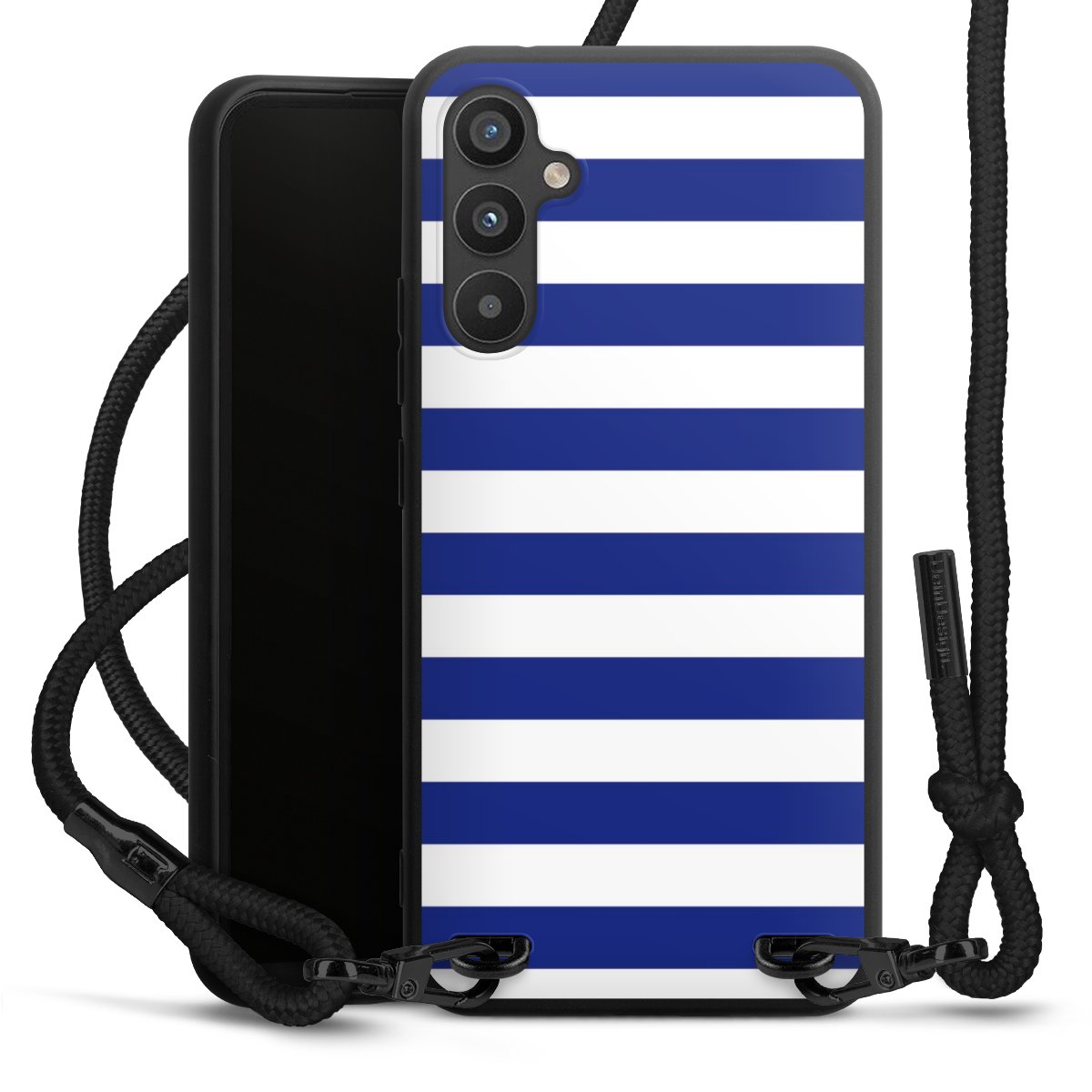 The matt black silicone case is made of flexible TPU (thermoplastic polyurethane) and offers robust protection. The durable, unbreakable material makes the cover flexible and dimensionally stable at the same time. The matte surface makes your design stand out more and is less susceptible to fingerprints and dirt. The stylish trend accessory fits comfortably in the hand and is perfectly complemented by the fabric (polyester) mobile phone strap. The braided fabric strap is approx. 1.70 metres long with a diameter of approx. 0.5 cm. Due to the special knotting technique, the length of the strap can be adjusted by simply pulling it, so that you can adapt it individually to your wishes. The practical case to wear around your neck is available with the fabric strap in black. As a little icing on the cake, we have provided the strap with a chic metal fastener in matt black. The strap is securely fastened to the case with loops made of high-quality genuine leather and press studs. The ends of the fabric strap are covered with metallic end caps and thus protected from fraying.