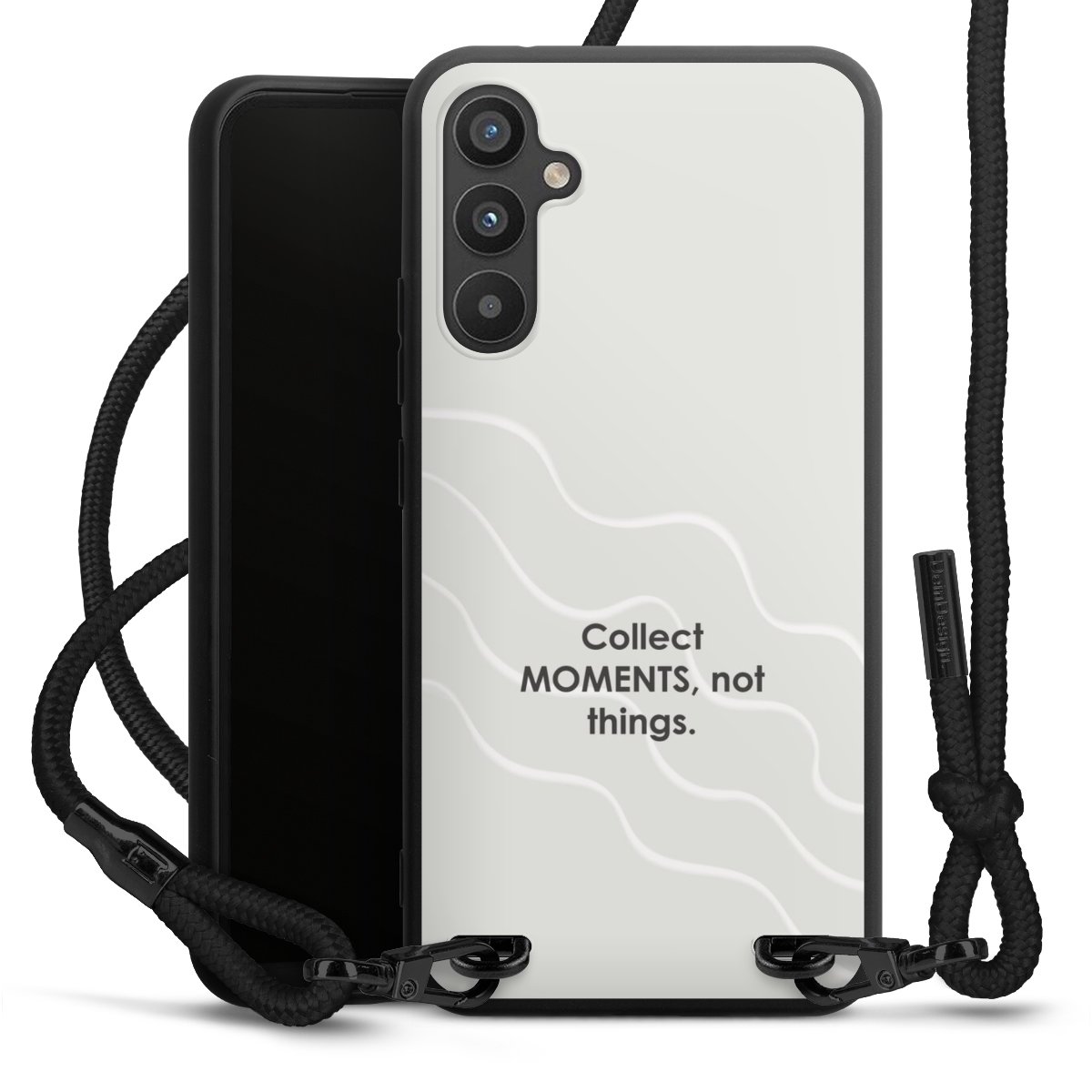 Pure Black: Phone case, fabric strap and metal details in stylish matt black.