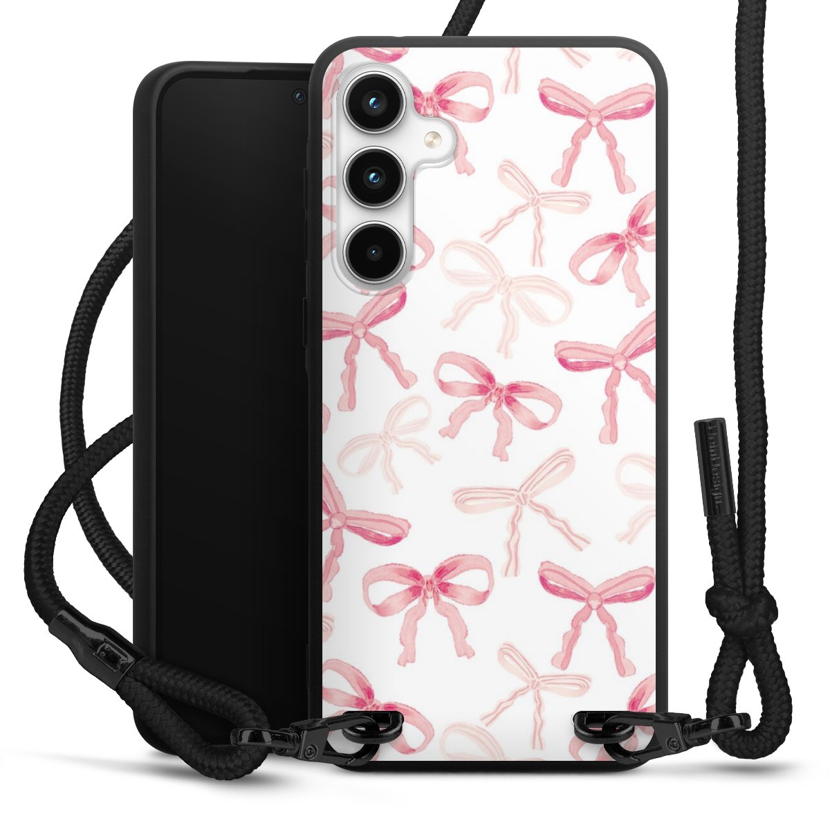 The matt black silicone case is made of flexible TPU (thermoplastic polyurethane) and offers robust protection. The durable, unbreakable material makes the cover flexible and dimensionally stable at the same time. The matte surface makes your design stand out more and is less susceptible to fingerprints and dirt. The stylish trend accessory fits comfortably in the hand and is perfectly complemented by the fabric (polyester) mobile phone strap. The braided fabric strap is approx. 1.70 metres long with a diameter of approx. 0.5 cm. Due to the special knotting technique, the length of the strap can be adjusted by simply pulling it, so that you can adapt it individually to your wishes. The practical case to wear around your neck is available with the fabric strap in black. As a little icing on the cake, we have provided the strap with a chic metal fastener in matt black. The strap is securely fastened to the case with loops made of high-quality genuine leather and press studs. The ends of the fabric strap are covered with metallic end caps and thus protected from fraying.