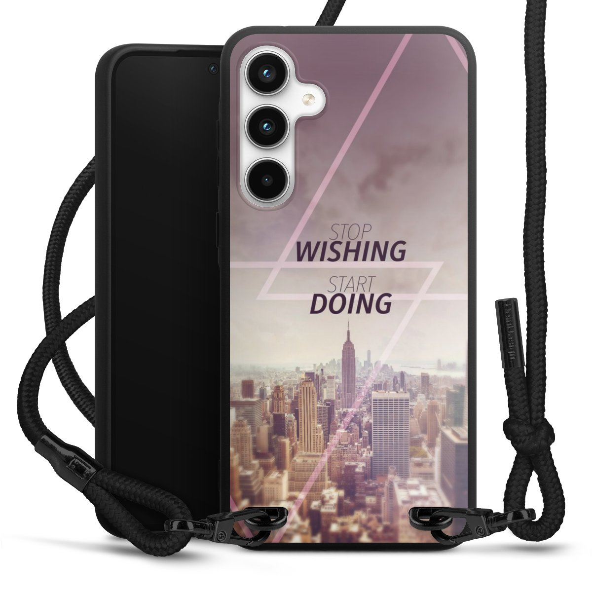 We use the solid direct print process for this phone case, which is why the print area only covers the back and the edge remains unprinted. The case to wear around your neck can be ordered unprinted, fully printed, or partially printed. For your design, either choose one of our exclusive shop motifs or get creative and create your own design, for example with photos and overlays. Design your own personal trend accessory and make an individual statement on the streets!