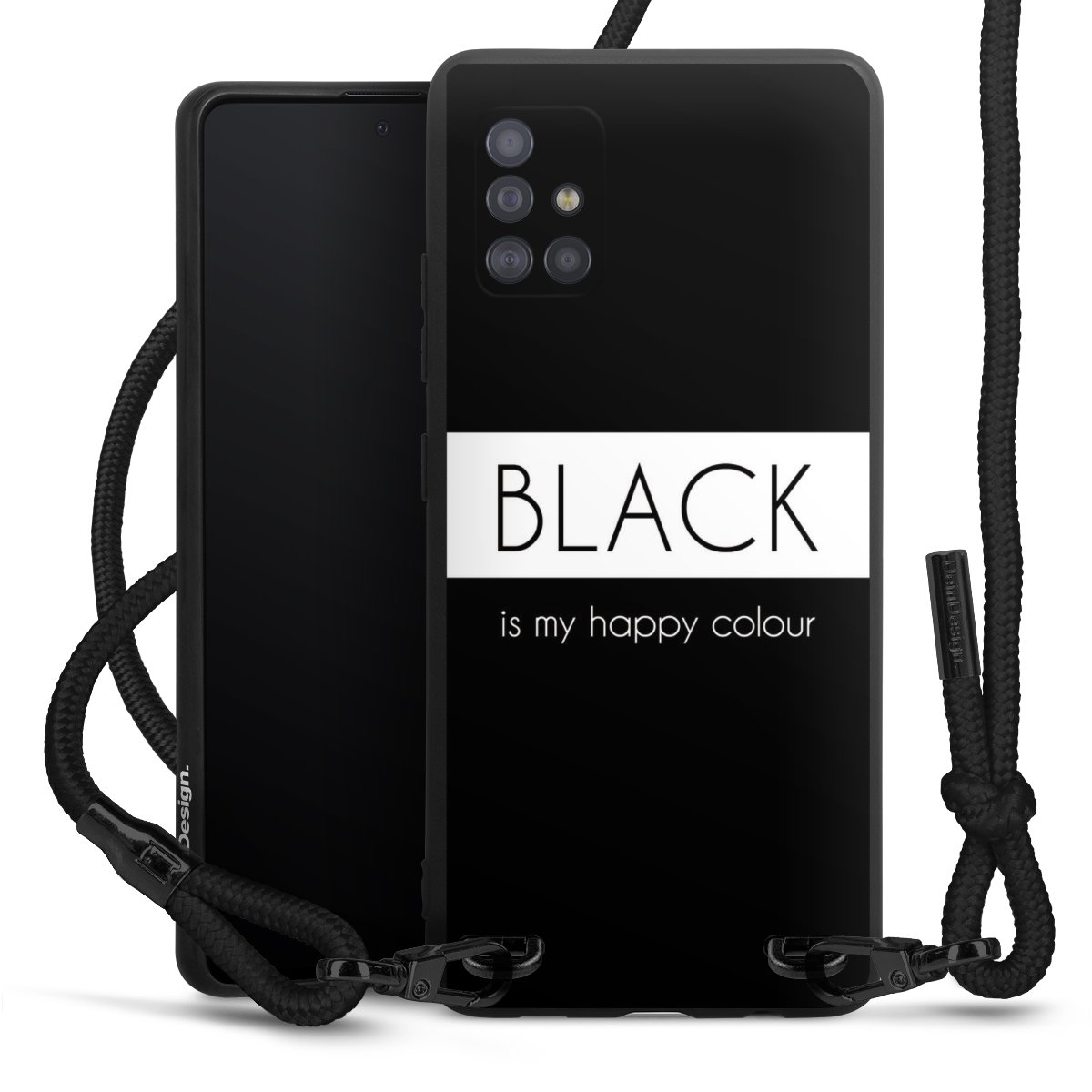The matt black silicone case is made of flexible TPU (thermoplastic polyurethane) and offers robust protection. The durable, unbreakable material makes the cover flexible and dimensionally stable at the same time. The matte surface makes your design stand out more and is less susceptible to fingerprints and dirt. The stylish trend accessory fits comfortably in the hand and is perfectly complemented by the fabric (polyester) mobile phone strap. The braided fabric strap is approx. 1.70 metres long with a diameter of approx. 0.5 cm. Due to the special knotting technique, the length of the strap can be adjusted by simply pulling it, so that you can adapt it individually to your wishes. The practical case to wear around your neck is available with the fabric strap in black. As a little icing on the cake, we have provided the strap with a chic metal fastener in matt black. The strap is securely fastened to the case with loops made of high-quality genuine leather and press studs. The ends of the fabric strap are covered with metallic end caps and thus protected from fraying.