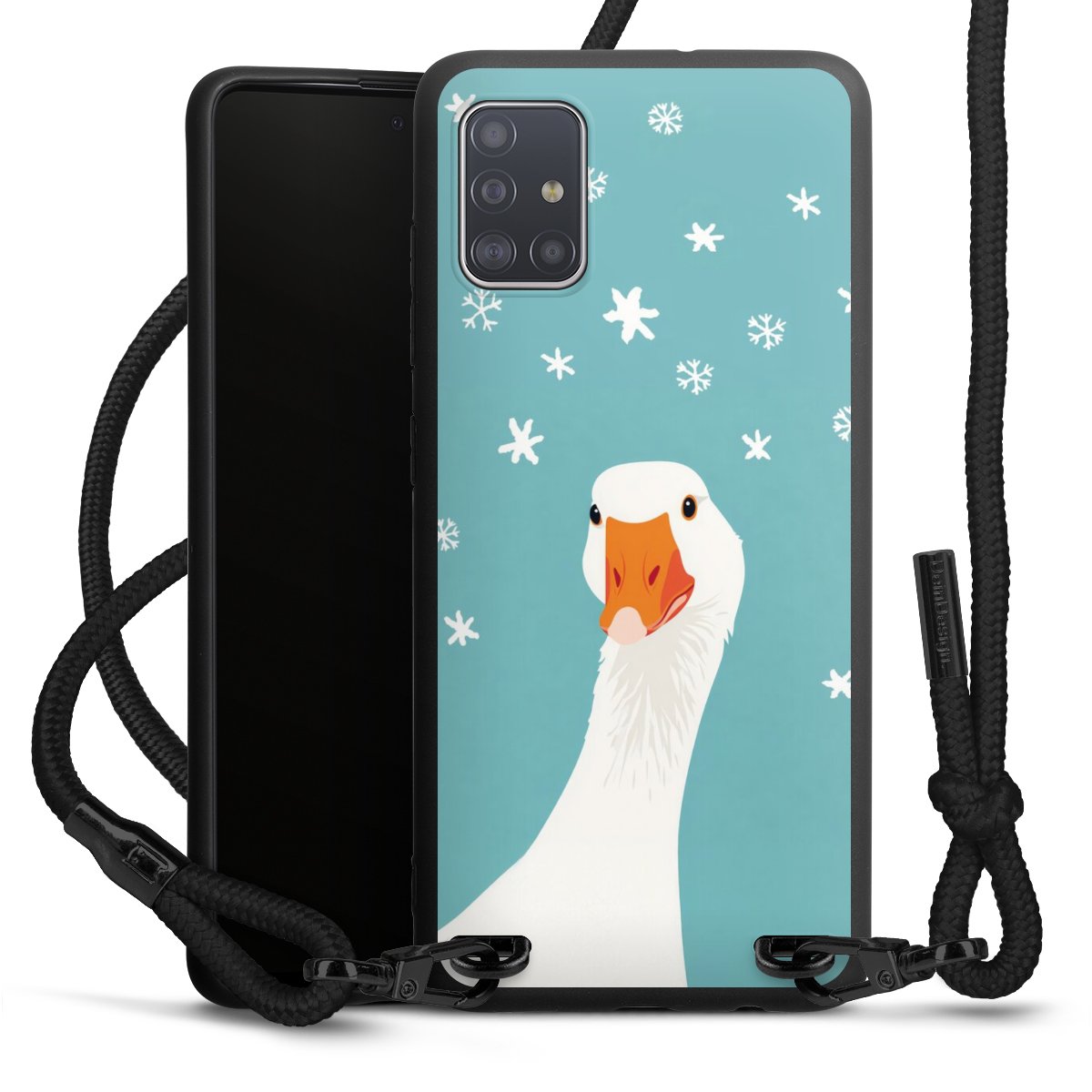 The matt black silicone case is made of flexible TPU (thermoplastic polyurethane) and offers robust protection. The durable, unbreakable material makes the cover flexible and dimensionally stable at the same time. The matte surface makes your design stand out more and is less susceptible to fingerprints and dirt. The stylish trend accessory fits comfortably in the hand and is perfectly complemented by the fabric (polyester) mobile phone strap. The braided fabric strap is approx. 1.70 metres long with a diameter of approx. 0.5 cm. Due to the special knotting technique, the length of the strap can be adjusted by simply pulling it, so that you can adapt it individually to your wishes. The practical case to wear around your neck is available with the fabric strap in black. As a little icing on the cake, we have provided the strap with a chic metal fastener in matt black. The strap is securely fastened to the case with loops made of high-quality genuine leather and press studs. The ends of the fabric strap are covered with metallic end caps and thus protected from fraying.