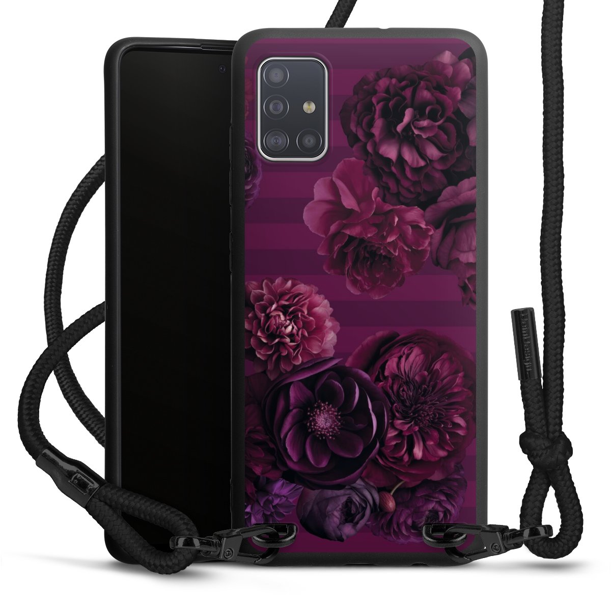 The matt black silicone case is made of flexible TPU (thermoplastic polyurethane) and offers robust protection. The durable, unbreakable material makes the cover flexible and dimensionally stable at the same time. The matte surface makes your design stand out more and is less susceptible to fingerprints and dirt. The stylish trend accessory fits comfortably in the hand and is perfectly complemented by the fabric (polyester) mobile phone strap. The braided fabric strap is approx. 1.70 metres long with a diameter of approx. 0.5 cm. Due to the special knotting technique, the length of the strap can be adjusted by simply pulling it, so that you can adapt it individually to your wishes. The practical case to wear around your neck is available with the fabric strap in black. As a little icing on the cake, we have provided the strap with a chic metal fastener in matt black. The strap is securely fastened to the case with loops made of high-quality genuine leather and press studs. The ends of the fabric strap are covered with metallic end caps and thus protected from fraying.