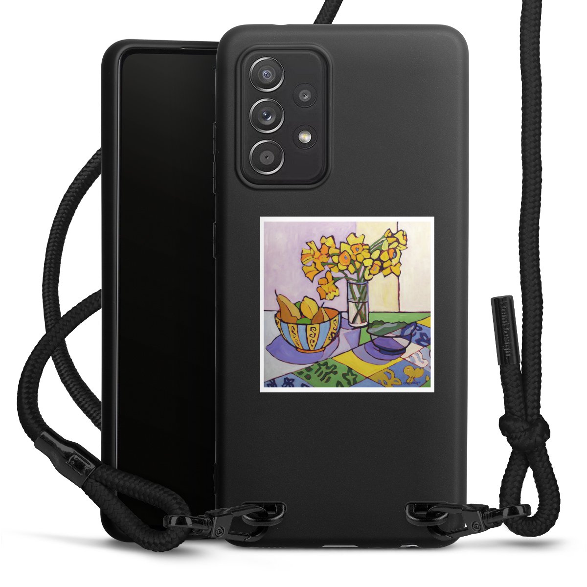 The matt black silicone case is made of flexible TPU (thermoplastic polyurethane) and offers robust protection. The durable, unbreakable material makes the cover flexible and dimensionally stable at the same time. The matte surface makes your design stand out more and is less susceptible to fingerprints and dirt. The stylish trend accessory fits comfortably in the hand and is perfectly complemented by the fabric (polyester) mobile phone strap. The braided fabric strap is approx. 1.70 metres long with a diameter of approx. 0.5 cm. Due to the special knotting technique, the length of the strap can be adjusted by simply pulling it, so that you can adapt it individually to your wishes. The practical case to wear around your neck is available with the fabric strap in black. As a little icing on the cake, we have provided the strap with a chic metal fastener in matt black. The strap is securely fastened to the case with loops made of high-quality genuine leather and press studs. The ends of the fabric strap are covered with metallic end caps and thus protected from fraying.