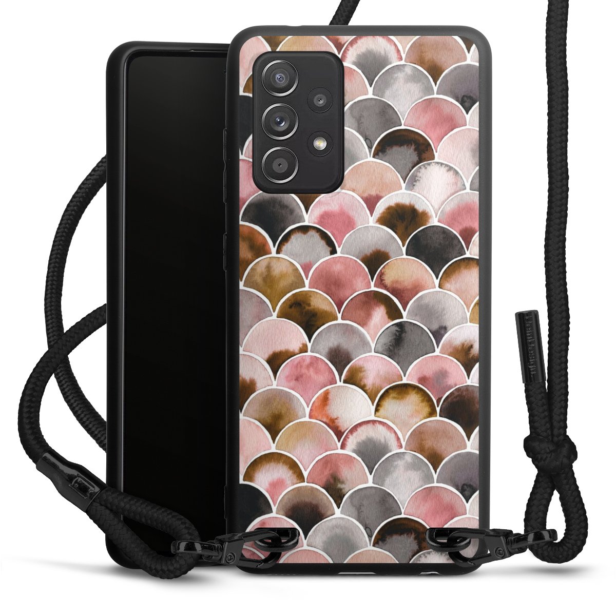The matt black silicone case is made of flexible TPU (thermoplastic polyurethane) and offers robust protection. The durable, unbreakable material makes the cover flexible and dimensionally stable at the same time. The matte surface makes your design stand out more and is less susceptible to fingerprints and dirt. The stylish trend accessory fits comfortably in the hand and is perfectly complemented by the fabric (polyester) mobile phone strap. The braided fabric strap is approx. 1.70 metres long with a diameter of approx. 0.5 cm. Due to the special knotting technique, the length of the strap can be adjusted by simply pulling it, so that you can adapt it individually to your wishes. The practical case to wear around your neck is available with the fabric strap in black. As a little icing on the cake, we have provided the strap with a chic metal fastener in matt black. The strap is securely fastened to the case with loops made of high-quality genuine leather and press studs. The ends of the fabric strap are covered with metallic end caps and thus protected from fraying.