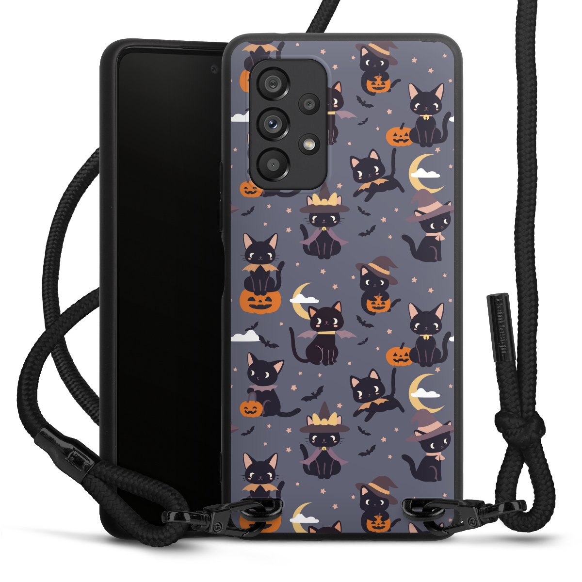 The matt black silicone case is made of flexible TPU (thermoplastic polyurethane) and offers robust protection. The durable, unbreakable material makes the cover flexible and dimensionally stable at the same time. The matte surface makes your design stand out more and is less susceptible to fingerprints and dirt. The stylish trend accessory fits comfortably in the hand and is perfectly complemented by the fabric (polyester) mobile phone strap. The braided fabric strap is approx. 1.70 metres long with a diameter of approx. 0.5 cm. Due to the special knotting technique, the length of the strap can be adjusted by simply pulling it, so that you can adapt it individually to your wishes. The practical case to wear around your neck is available with the fabric strap in black. As a little icing on the cake, we have provided the strap with a chic metal fastener in matt black. The strap is securely fastened to the case with loops made of high-quality genuine leather and press studs. The ends of the fabric strap are covered with metallic end caps and thus protected from fraying.
