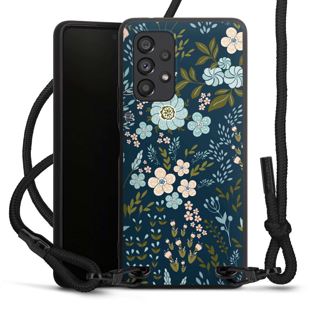 The matt black silicone case is made of flexible TPU (thermoplastic polyurethane) and offers robust protection. The durable, unbreakable material makes the cover flexible and dimensionally stable at the same time. The matte surface makes your design stand out more and is less susceptible to fingerprints and dirt. The stylish trend accessory fits comfortably in the hand and is perfectly complemented by the fabric (polyester) mobile phone strap. The braided fabric strap is approx. 1.70 metres long with a diameter of approx. 0.5 cm. Due to the special knotting technique, the length of the strap can be adjusted by simply pulling it, so that you can adapt it individually to your wishes. The practical case to wear around your neck is available with the fabric strap in black. As a little icing on the cake, we have provided the strap with a chic metal fastener in matt black. The strap is securely fastened to the case with loops made of high-quality genuine leather and press studs. The ends of the fabric strap are covered with metallic end caps and thus protected from fraying.