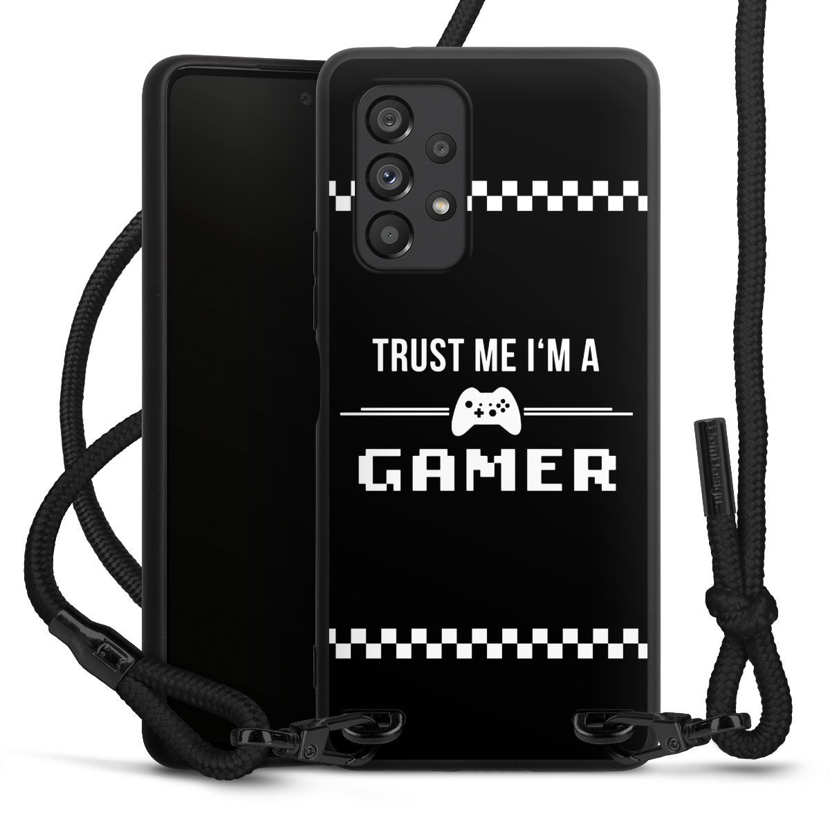 The matt black silicone case is made of flexible TPU (thermoplastic polyurethane) and offers robust protection. The durable, unbreakable material makes the cover flexible and dimensionally stable at the same time. The matte surface makes your design stand out more and is less susceptible to fingerprints and dirt. The stylish trend accessory fits comfortably in the hand and is perfectly complemented by the fabric (polyester) mobile phone strap. The braided fabric strap is approx. 1.70 metres long with a diameter of approx. 0.5 cm. Due to the special knotting technique, the length of the strap can be adjusted by simply pulling it, so that you can adapt it individually to your wishes. The practical case to wear around your neck is available with the fabric strap in black. As a little icing on the cake, we have provided the strap with a chic metal fastener in matt black. The strap is securely fastened to the case with loops made of high-quality genuine leather and press studs. The ends of the fabric strap are covered with metallic end caps and thus protected from fraying.