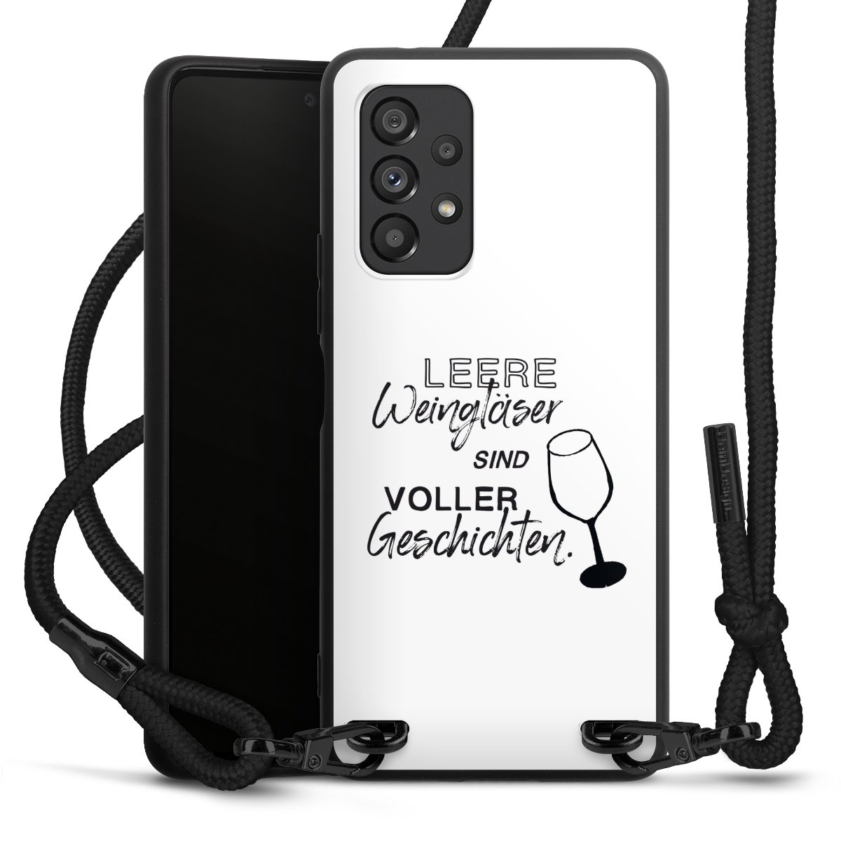 The matt black silicone case is made of flexible TPU (thermoplastic polyurethane) and offers robust protection. The durable, unbreakable material makes the cover flexible and dimensionally stable at the same time. The matte surface makes your design stand out more and is less susceptible to fingerprints and dirt. The stylish trend accessory fits comfortably in the hand and is perfectly complemented by the fabric (polyester) mobile phone strap. The braided fabric strap is approx. 1.70 metres long with a diameter of approx. 0.5 cm. Due to the special knotting technique, the length of the strap can be adjusted by simply pulling it, so that you can adapt it individually to your wishes. The practical case to wear around your neck is available with the fabric strap in black. As a little icing on the cake, we have provided the strap with a chic metal fastener in matt black. The strap is securely fastened to the case with loops made of high-quality genuine leather and press studs. The ends of the fabric strap are covered with metallic end caps and thus protected from fraying.