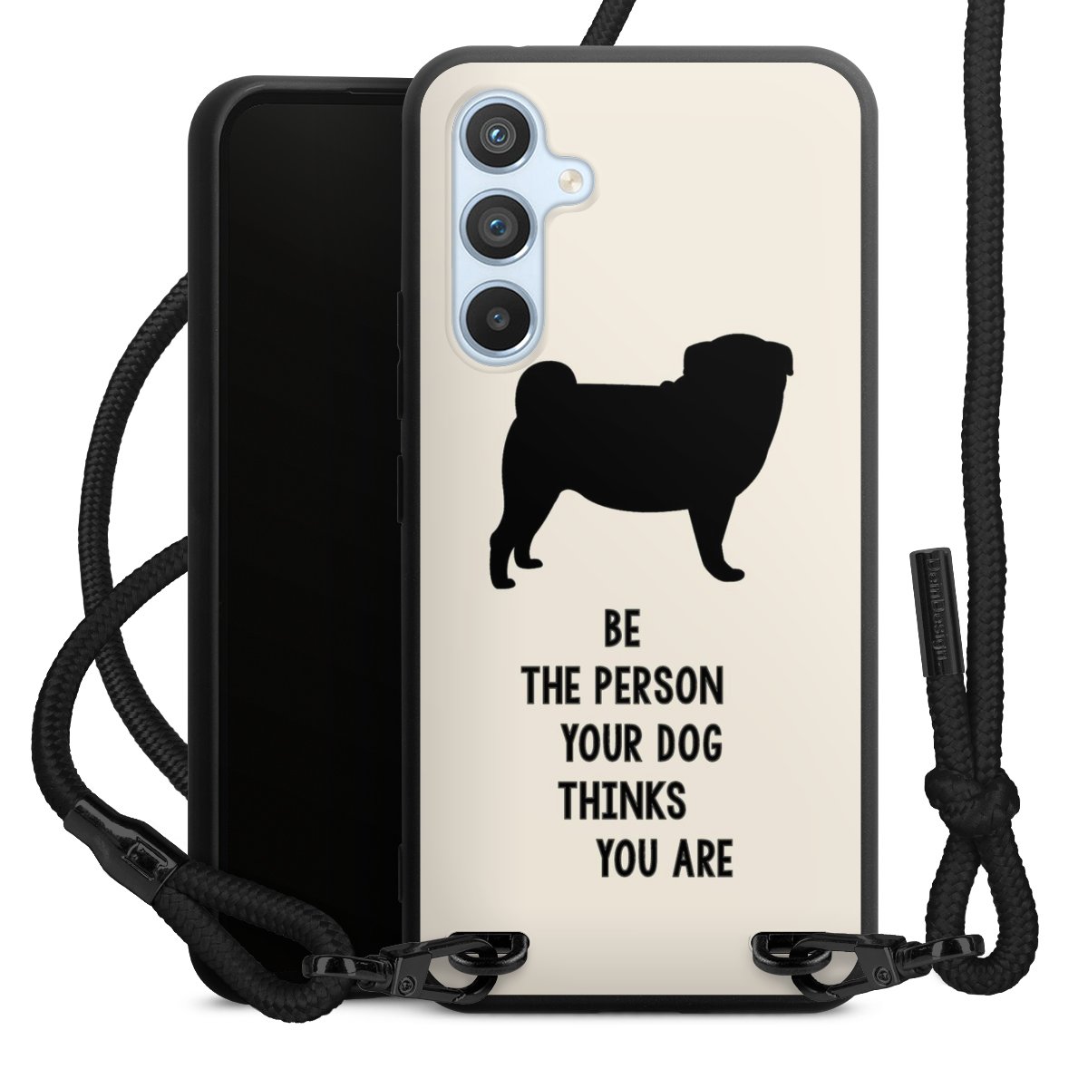 The matt black silicone case is made of flexible TPU (thermoplastic polyurethane) and offers robust protection. The durable, unbreakable material makes the cover flexible and dimensionally stable at the same time. The matte surface makes your design stand out more and is less susceptible to fingerprints and dirt. The stylish trend accessory fits comfortably in the hand and is perfectly complemented by the fabric (polyester) mobile phone strap. The braided fabric strap is approx. 1.70 metres long with a diameter of approx. 0.5 cm. Due to the special knotting technique, the length of the strap can be adjusted by simply pulling it, so that you can adapt it individually to your wishes. The practical case to wear around your neck is available with the fabric strap in black. As a little icing on the cake, we have provided the strap with a chic metal fastener in matt black. The strap is securely fastened to the case with loops made of high-quality genuine leather and press studs. The ends of the fabric strap are covered with metallic end caps and thus protected from fraying.