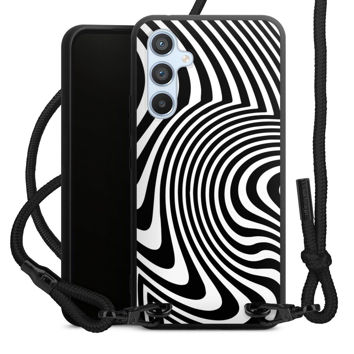 The matt black silicone case is made of flexible TPU (thermoplastic polyurethane) and offers robust protection. The durable, unbreakable material makes the cover flexible and dimensionally stable at the same time. The matte surface makes your design stand out more and is less susceptible to fingerprints and dirt. The stylish trend accessory fits comfortably in the hand and is perfectly complemented by the fabric (polyester) mobile phone strap. The braided fabric strap is approx. 1.70 metres long with a diameter of approx. 0.5 cm. Due to the special knotting technique, the length of the strap can be adjusted by simply pulling it, so that you can adapt it individually to your wishes. The practical case to wear around your neck is available with the fabric strap in black. As a little icing on the cake, we have provided the strap with a chic metal fastener in matt black. The strap is securely fastened to the case with loops made of high-quality genuine leather and press studs. The ends of the fabric strap are covered with metallic end caps and thus protected from fraying.