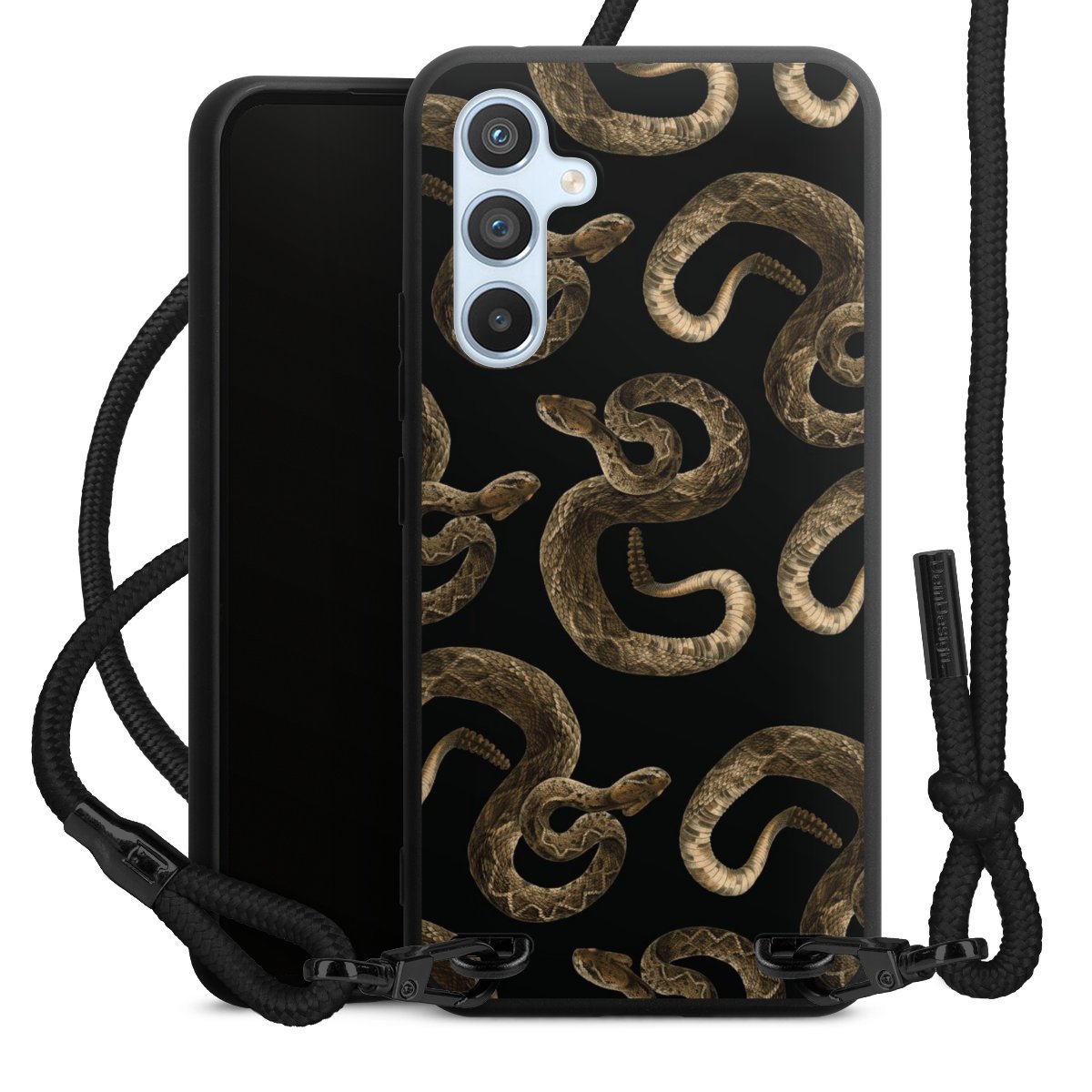 The matt black silicone case is made of flexible TPU (thermoplastic polyurethane) and offers robust protection. The durable, unbreakable material makes the cover flexible and dimensionally stable at the same time. The matte surface makes your design stand out more and is less susceptible to fingerprints and dirt. The stylish trend accessory fits comfortably in the hand and is perfectly complemented by the fabric (polyester) mobile phone strap. The braided fabric strap is approx. 1.70 metres long with a diameter of approx. 0.5 cm. Due to the special knotting technique, the length of the strap can be adjusted by simply pulling it, so that you can adapt it individually to your wishes. The practical case to wear around your neck is available with the fabric strap in black. As a little icing on the cake, we have provided the strap with a chic metal fastener in matt black. The strap is securely fastened to the case with loops made of high-quality genuine leather and press studs. The ends of the fabric strap are covered with metallic end caps and thus protected from fraying.