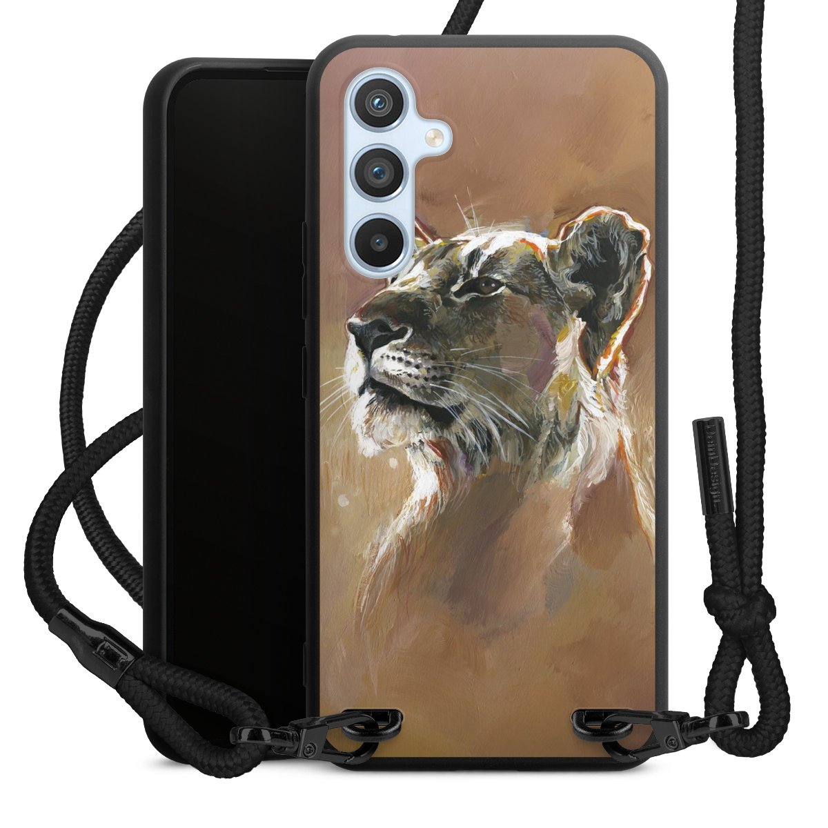 The matt black silicone case is made of flexible TPU (thermoplastic polyurethane) and offers robust protection. The durable, unbreakable material makes the cover flexible and dimensionally stable at the same time. The matte surface makes your design stand out more and is less susceptible to fingerprints and dirt. The stylish trend accessory fits comfortably in the hand and is perfectly complemented by the fabric (polyester) mobile phone strap. The braided fabric strap is approx. 1.70 metres long with a diameter of approx. 0.5 cm. Due to the special knotting technique, the length of the strap can be adjusted by simply pulling it, so that you can adapt it individually to your wishes. The practical case to wear around your neck is available with the fabric strap in black. As a little icing on the cake, we have provided the strap with a chic metal fastener in matt black. The strap is securely fastened to the case with loops made of high-quality genuine leather and press studs. The ends of the fabric strap are covered with metallic end caps and thus protected from fraying.