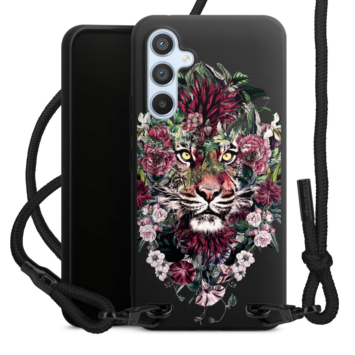 The matt black silicone case is made of flexible TPU (thermoplastic polyurethane) and offers robust protection. The durable, unbreakable material makes the cover flexible and dimensionally stable at the same time. The matte surface makes your design stand out more and is less susceptible to fingerprints and dirt. The stylish trend accessory fits comfortably in the hand and is perfectly complemented by the fabric (polyester) mobile phone strap. The braided fabric strap is approx. 1.70 metres long with a diameter of approx. 0.5 cm. Due to the special knotting technique, the length of the strap can be adjusted by simply pulling it, so that you can adapt it individually to your wishes. The practical case to wear around your neck is available with the fabric strap in black. As a little icing on the cake, we have provided the strap with a chic metal fastener in matt black. The strap is securely fastened to the case with loops made of high-quality genuine leather and press studs. The ends of the fabric strap are covered with metallic end caps and thus protected from fraying.