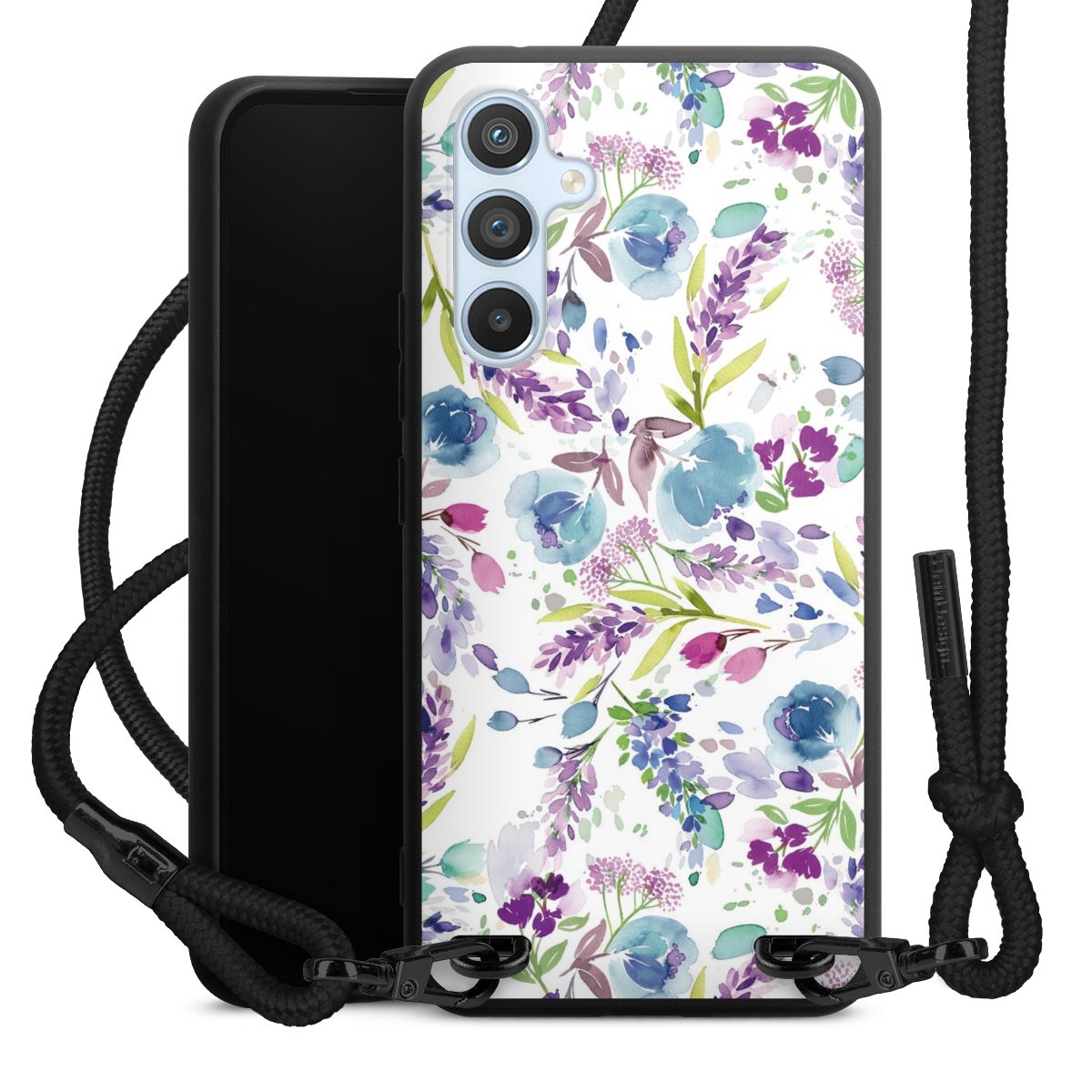 The matt black silicone case is made of flexible TPU (thermoplastic polyurethane) and offers robust protection. The durable, unbreakable material makes the cover flexible and dimensionally stable at the same time. The matte surface makes your design stand out more and is less susceptible to fingerprints and dirt. The stylish trend accessory fits comfortably in the hand and is perfectly complemented by the fabric (polyester) mobile phone strap. The braided fabric strap is approx. 1.70 metres long with a diameter of approx. 0.5 cm. Due to the special knotting technique, the length of the strap can be adjusted by simply pulling it, so that you can adapt it individually to your wishes. The practical case to wear around your neck is available with the fabric strap in black. As a little icing on the cake, we have provided the strap with a chic metal fastener in matt black. The strap is securely fastened to the case with loops made of high-quality genuine leather and press studs. The ends of the fabric strap are covered with metallic end caps and thus protected from fraying.