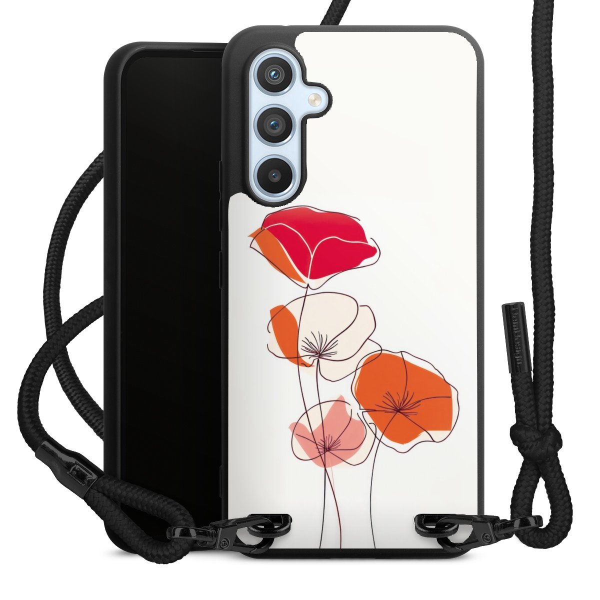 The matt black silicone case is made of flexible TPU (thermoplastic polyurethane) and offers robust protection. The durable, unbreakable material makes the cover flexible and dimensionally stable at the same time. The matte surface makes your design stand out more and is less susceptible to fingerprints and dirt. The stylish trend accessory fits comfortably in the hand and is perfectly complemented by the fabric (polyester) mobile phone strap. The braided fabric strap is approx. 1.70 metres long with a diameter of approx. 0.5 cm. Due to the special knotting technique, the length of the strap can be adjusted by simply pulling it, so that you can adapt it individually to your wishes. The practical case to wear around your neck is available with the fabric strap in black. As a little icing on the cake, we have provided the strap with a chic metal fastener in matt black. The strap is securely fastened to the case with loops made of high-quality genuine leather and press studs. The ends of the fabric strap are covered with metallic end caps and thus protected from fraying.