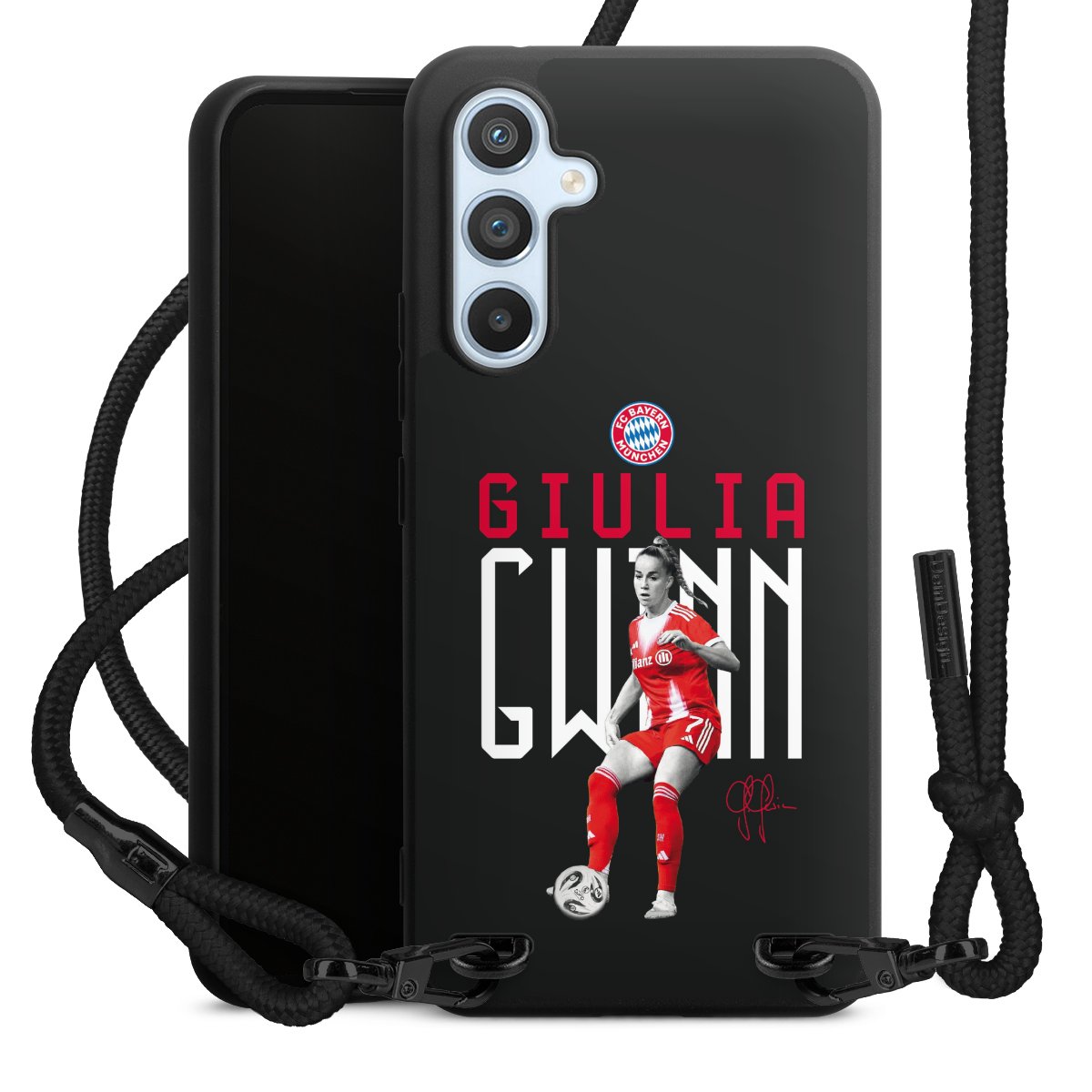 The matt black silicone case is made of flexible TPU (thermoplastic polyurethane) and offers robust protection. The durable, unbreakable material makes the cover flexible and dimensionally stable at the same time. The matte surface makes your design stand out more and is less susceptible to fingerprints and dirt. The stylish trend accessory fits comfortably in the hand and is perfectly complemented by the fabric (polyester) mobile phone strap. The braided fabric strap is approx. 1.70 metres long with a diameter of approx. 0.5 cm. Due to the special knotting technique, the length of the strap can be adjusted by simply pulling it, so that you can adapt it individually to your wishes. The practical case to wear around your neck is available with the fabric strap in black. As a little icing on the cake, we have provided the strap with a chic metal fastener in matt black. The strap is securely fastened to the case with loops made of high-quality genuine leather and press studs. The ends of the fabric strap are covered with metallic end caps and thus protected from fraying.