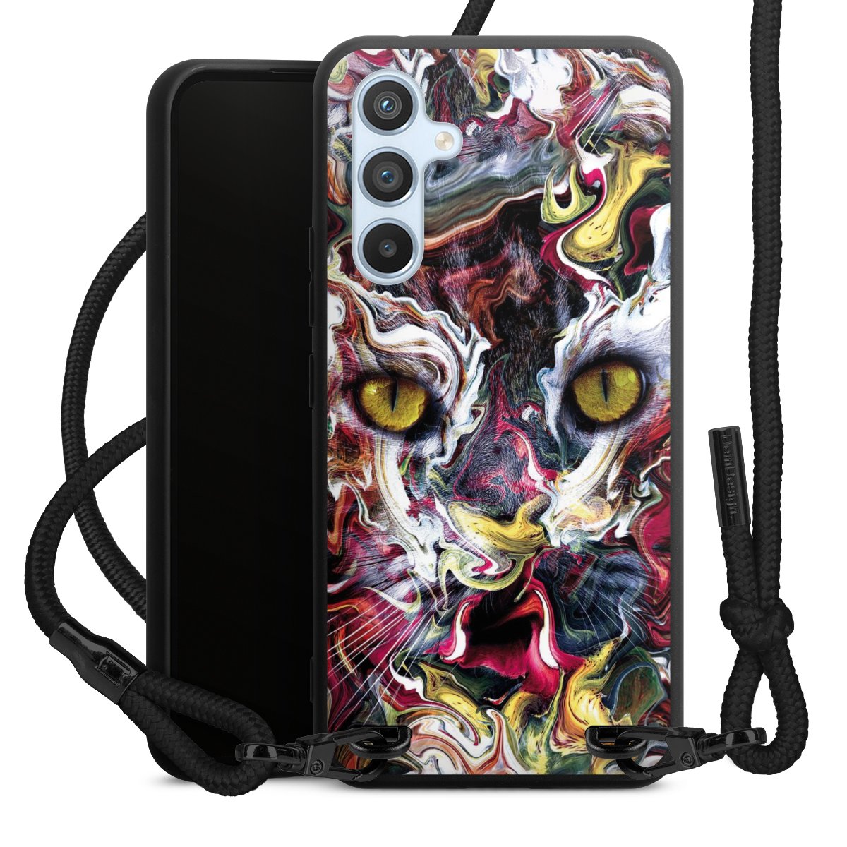 The matt black silicone case is made of flexible TPU (thermoplastic polyurethane) and offers robust protection. The durable, unbreakable material makes the cover flexible and dimensionally stable at the same time. The matte surface makes your design stand out more and is less susceptible to fingerprints and dirt. The stylish trend accessory fits comfortably in the hand and is perfectly complemented by the fabric (polyester) mobile phone strap. The braided fabric strap is approx. 1.70 metres long with a diameter of approx. 0.5 cm. Due to the special knotting technique, the length of the strap can be adjusted by simply pulling it, so that you can adapt it individually to your wishes. The practical case to wear around your neck is available with the fabric strap in black. As a little icing on the cake, we have provided the strap with a chic metal fastener in matt black. The strap is securely fastened to the case with loops made of high-quality genuine leather and press studs. The ends of the fabric strap are covered with metallic end caps and thus protected from fraying.