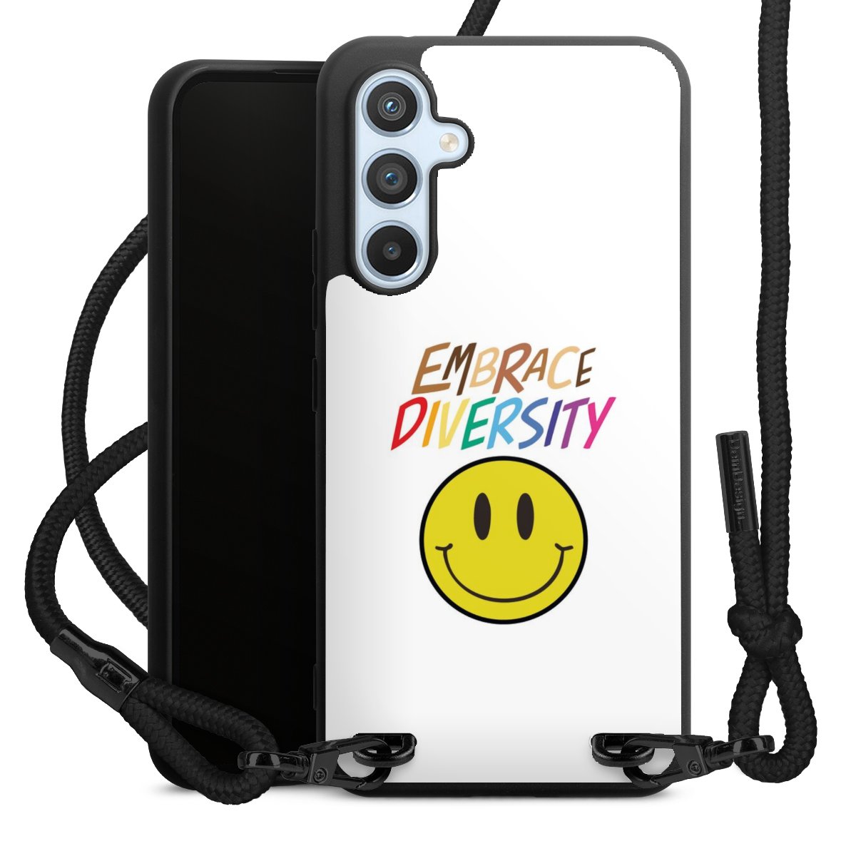 The matt black silicone case is made of flexible TPU (thermoplastic polyurethane) and offers robust protection. The durable, unbreakable material makes the cover flexible and dimensionally stable at the same time. The matte surface makes your design stand out more and is less susceptible to fingerprints and dirt. The stylish trend accessory fits comfortably in the hand and is perfectly complemented by the fabric (polyester) mobile phone strap. The braided fabric strap is approx. 1.70 metres long with a diameter of approx. 0.5 cm. Due to the special knotting technique, the length of the strap can be adjusted by simply pulling it, so that you can adapt it individually to your wishes. The practical case to wear around your neck is available with the fabric strap in black. As a little icing on the cake, we have provided the strap with a chic metal fastener in matt black. The strap is securely fastened to the case with loops made of high-quality genuine leather and press studs. The ends of the fabric strap are covered with metallic end caps and thus protected from fraying.