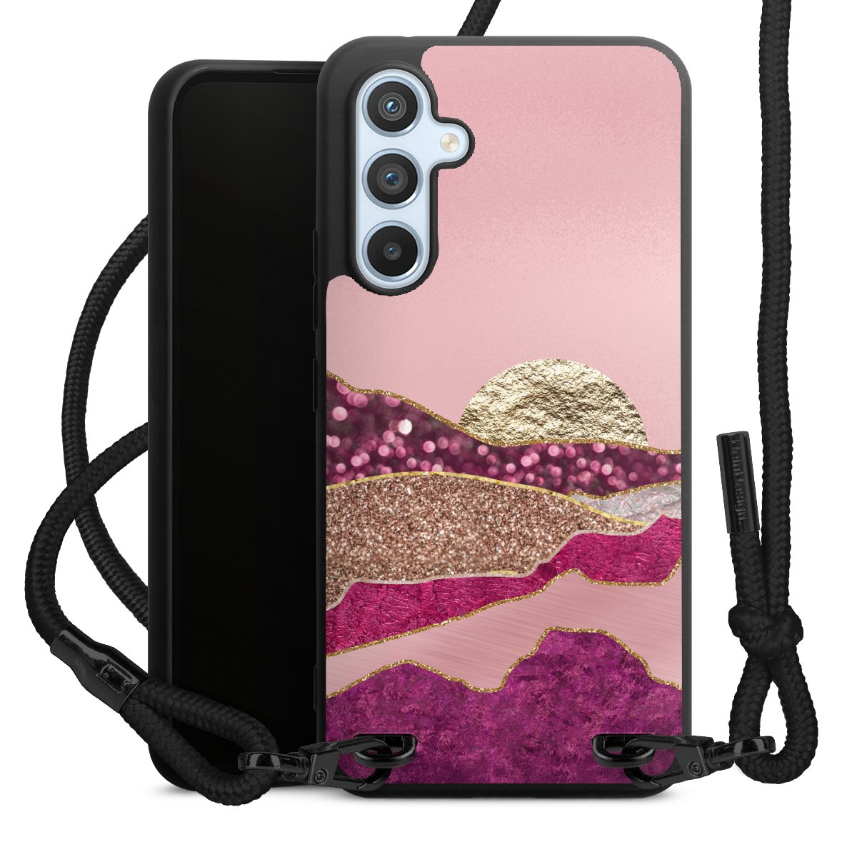 The matt black silicone case is made of flexible TPU (thermoplastic polyurethane) and offers robust protection. The durable, unbreakable material makes the cover flexible and dimensionally stable at the same time. The matte surface makes your design stand out more and is less susceptible to fingerprints and dirt. The stylish trend accessory fits comfortably in the hand and is perfectly complemented by the fabric (polyester) mobile phone strap. The braided fabric strap is approx. 1.70 metres long with a diameter of approx. 0.5 cm. Due to the special knotting technique, the length of the strap can be adjusted by simply pulling it, so that you can adapt it individually to your wishes. The practical case to wear around your neck is available with the fabric strap in black. As a little icing on the cake, we have provided the strap with a chic metal fastener in matt black. The strap is securely fastened to the case with loops made of high-quality genuine leather and press studs. The ends of the fabric strap are covered with metallic end caps and thus protected from fraying.