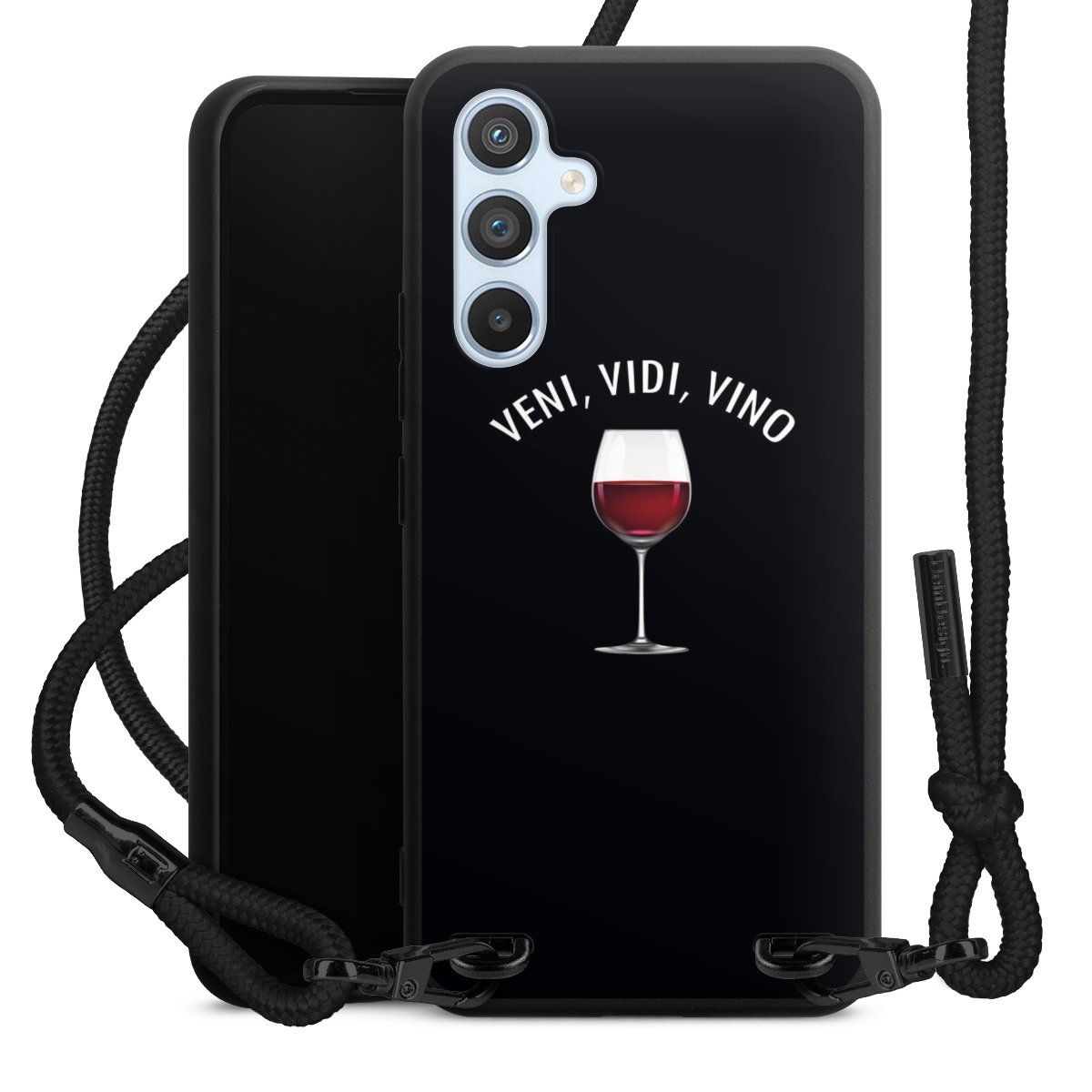 The matt black silicone case is made of flexible TPU (thermoplastic polyurethane) and offers robust protection. The durable, unbreakable material makes the cover flexible and dimensionally stable at the same time. The matte surface makes your design stand out more and is less susceptible to fingerprints and dirt. The stylish trend accessory fits comfortably in the hand and is perfectly complemented by the fabric (polyester) mobile phone strap. The braided fabric strap is approx. 1.70 metres long with a diameter of approx. 0.5 cm. Due to the special knotting technique, the length of the strap can be adjusted by simply pulling it, so that you can adapt it individually to your wishes. The practical case to wear around your neck is available with the fabric strap in black. As a little icing on the cake, we have provided the strap with a chic metal fastener in matt black. The strap is securely fastened to the case with loops made of high-quality genuine leather and press studs. The ends of the fabric strap are covered with metallic end caps and thus protected from fraying.