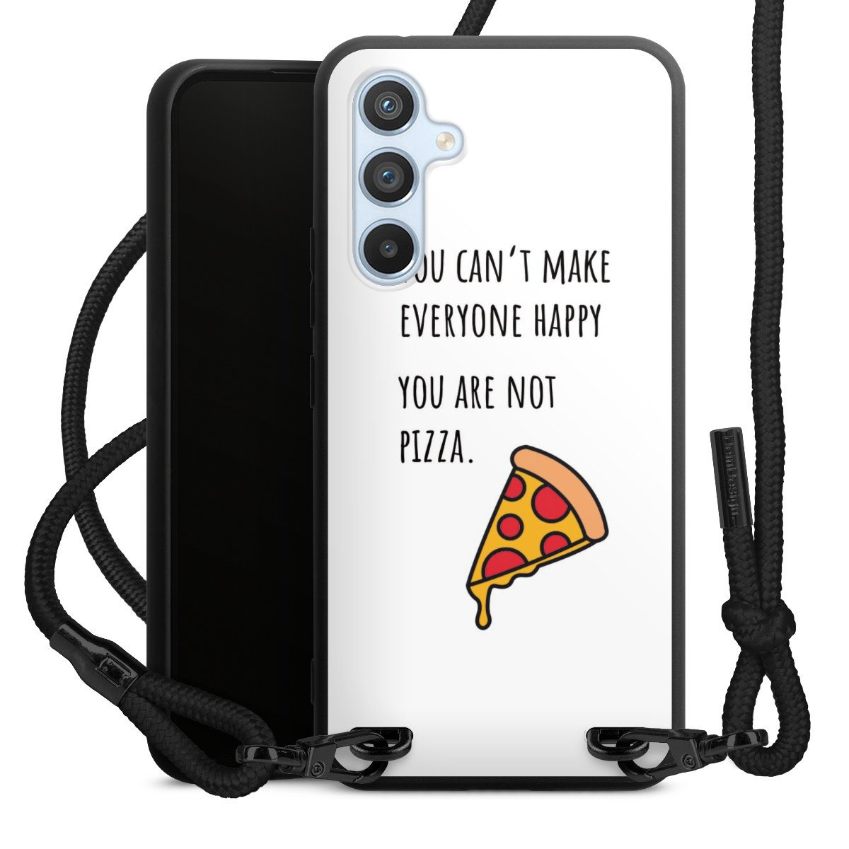 The matt black silicone case is made of flexible TPU (thermoplastic polyurethane) and offers robust protection. The durable, unbreakable material makes the cover flexible and dimensionally stable at the same time. The matte surface makes your design stand out more and is less susceptible to fingerprints and dirt. The stylish trend accessory fits comfortably in the hand and is perfectly complemented by the fabric (polyester) mobile phone strap. The braided fabric strap is approx. 1.70 metres long with a diameter of approx. 0.5 cm. Due to the special knotting technique, the length of the strap can be adjusted by simply pulling it, so that you can adapt it individually to your wishes. The practical case to wear around your neck is available with the fabric strap in black. As a little icing on the cake, we have provided the strap with a chic metal fastener in matt black. The strap is securely fastened to the case with loops made of high-quality genuine leather and press studs. The ends of the fabric strap are covered with metallic end caps and thus protected from fraying.